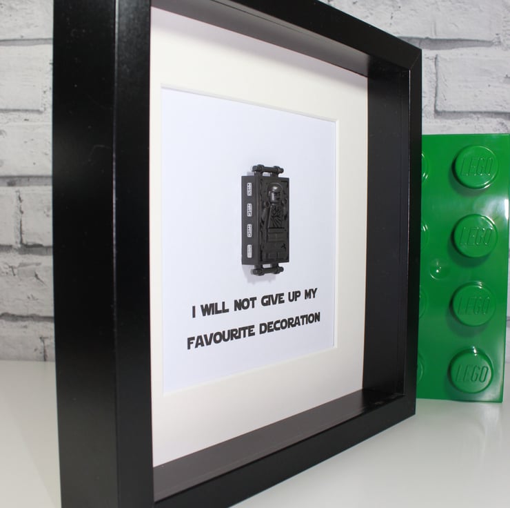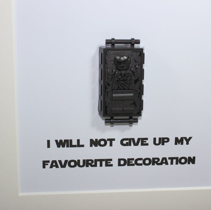 Our latest offering features a mounted Lego minifigure of Han Solo in carbonite from the original Star Wars Trilogy. Underneath we have printed the quote uttered by Jabba the Hutt - "I will not give up my favourite decoration."