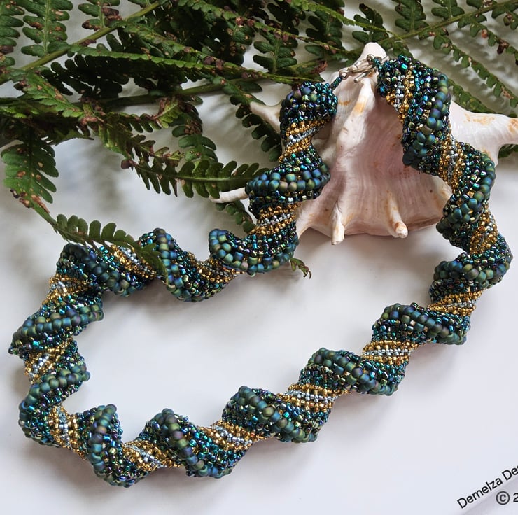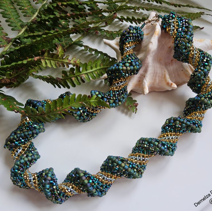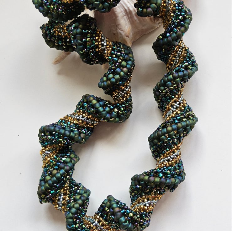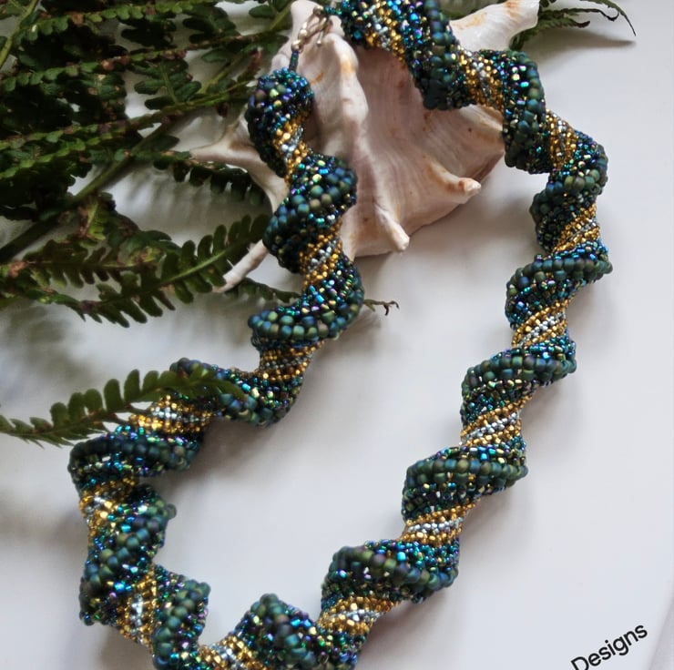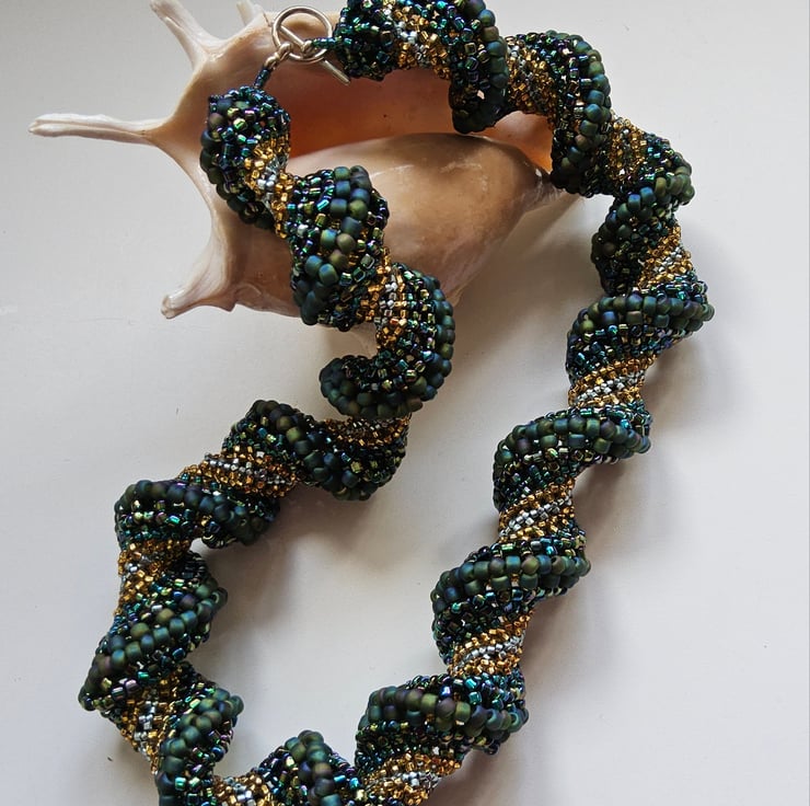 This stunning necklace has been lovingly hand crafted using small glass seed beads of various sizes and types to create a bead woven chunky statement necklace. The sculptural helix forms a self supporting hollow tube.