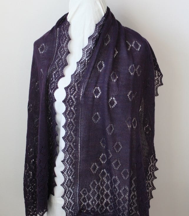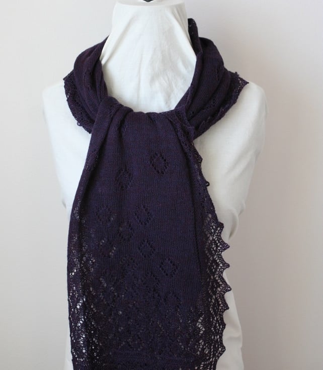 This Scarf/Wrap has been hand knitted to my own design in 100% merino wool. With lace patterning at the ends and a lace border the design is a more contemporary take on the traditional lace knitting. In the design I have utilised patterns and construction methods from the lace knitting traditions of Shetland and Orenburg.