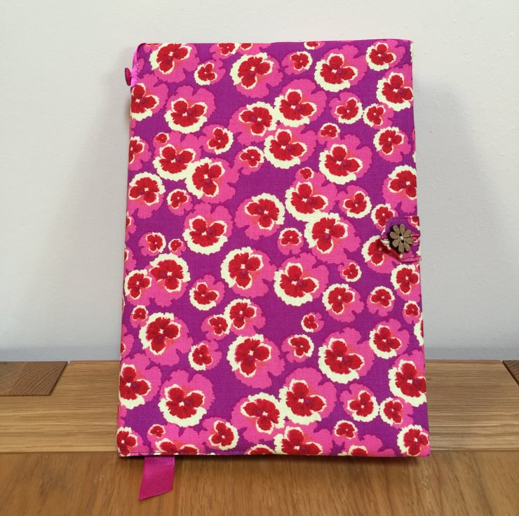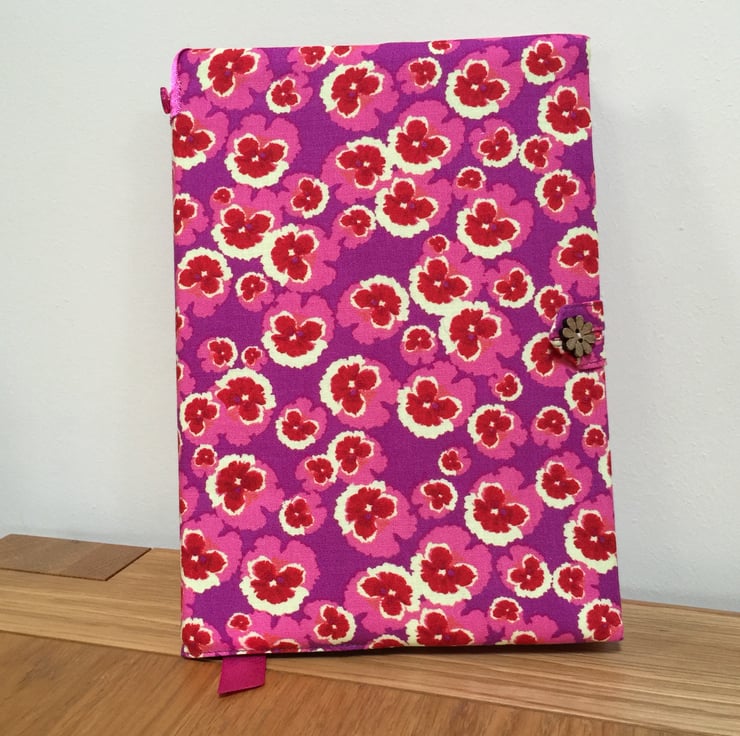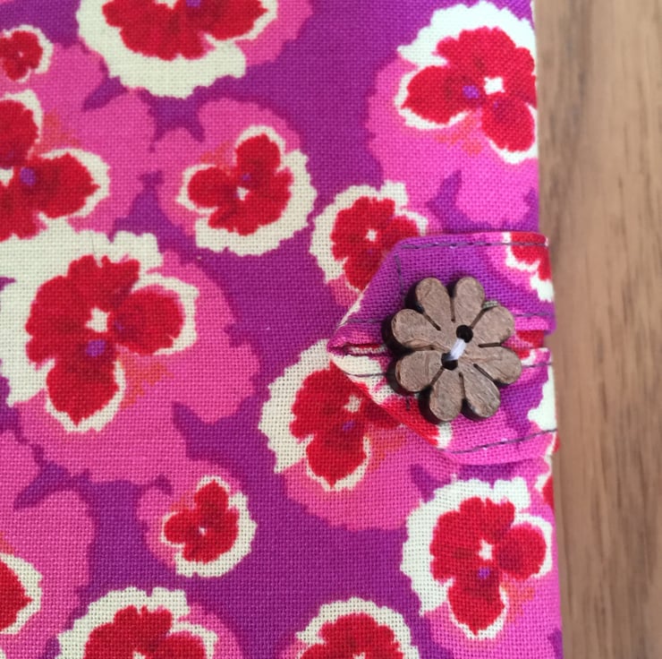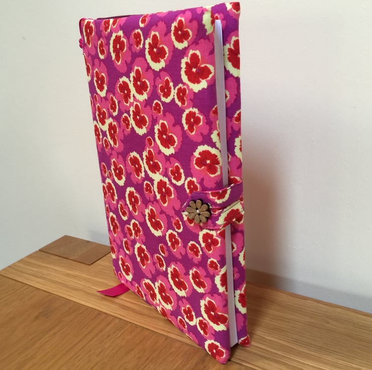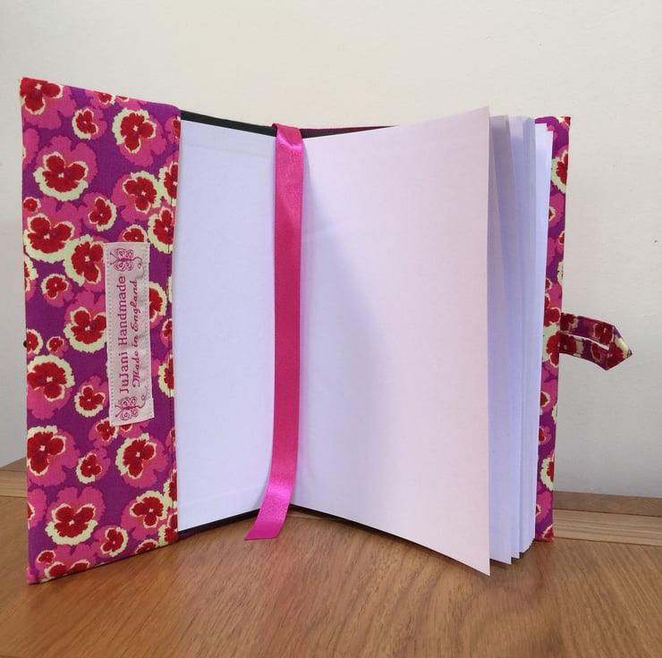 This fabric covered notebook has been made from a bold purple/pink pansy print cotton and lined with a contrasting cotton fabric.It has a fabric and flower shaped wooden button closure and a satin ribbon bookmark.A pink glitter flower button has been added to the outside cover for decoration.