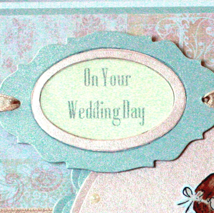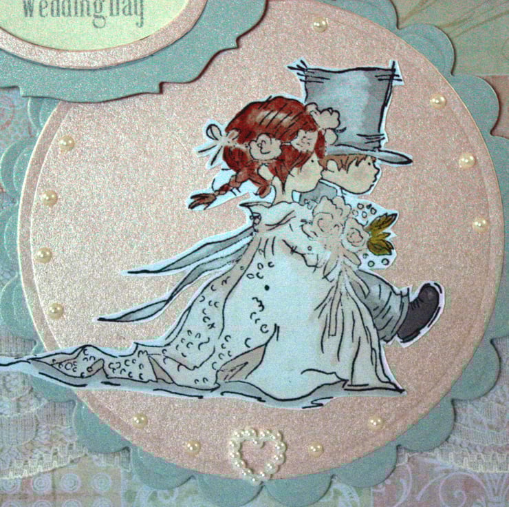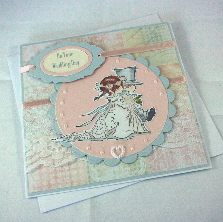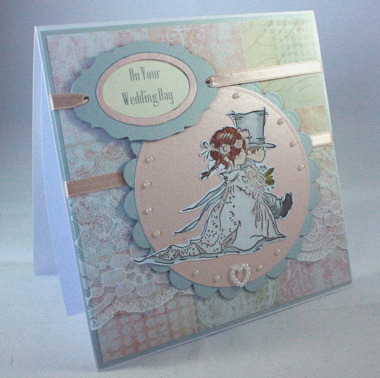 Square wedding card featuring a hand stamped image of a cute bride and groom. The image has been coloured using Promarkers and finished with faux pearls. The image is layered onto pretty pastel paper and silver grey card with white lace and peach satin ribbon. The message reads: 'On Your Wedding Day'