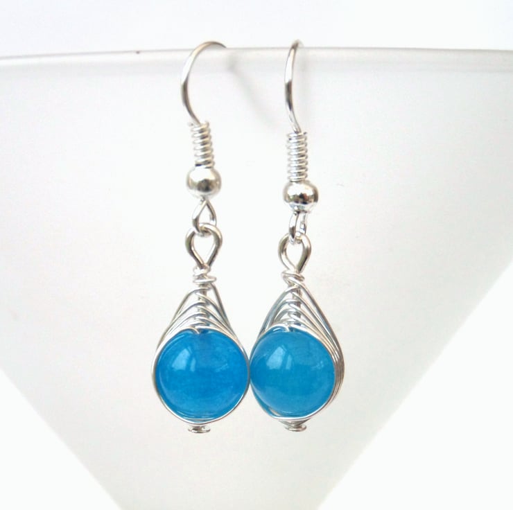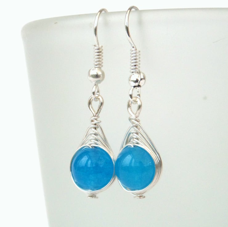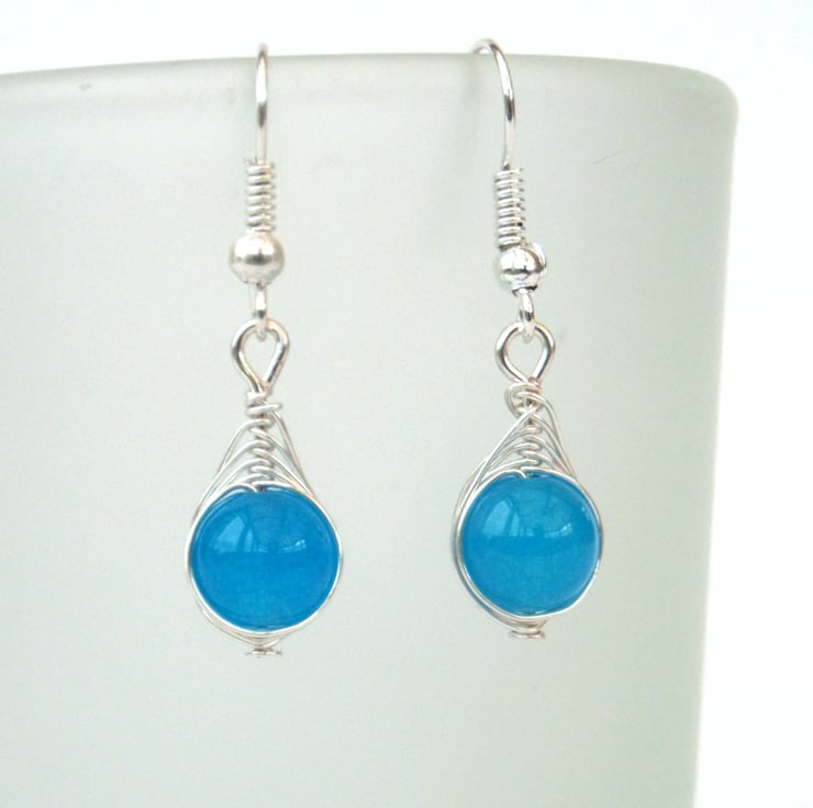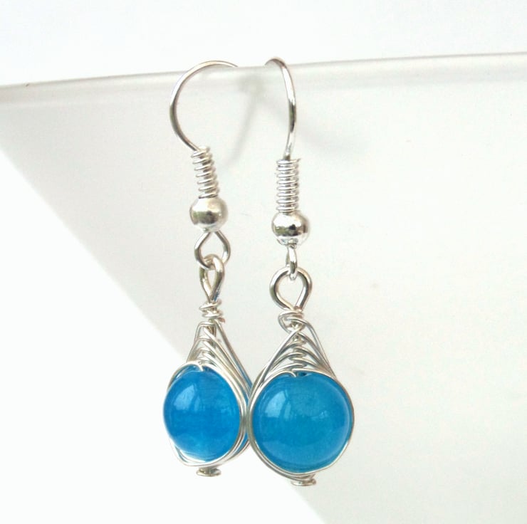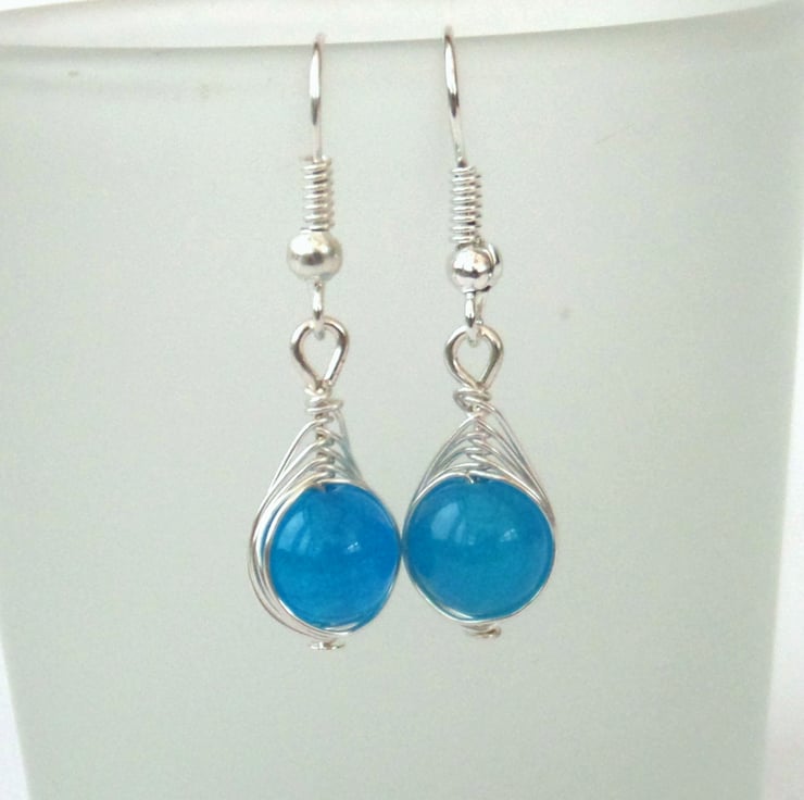 Stunning coloured dyed jade beads are wrapped in anti-tarnish wire to make these lovely earrings.