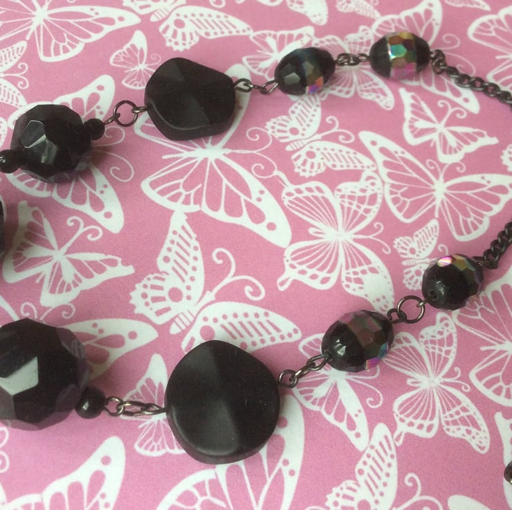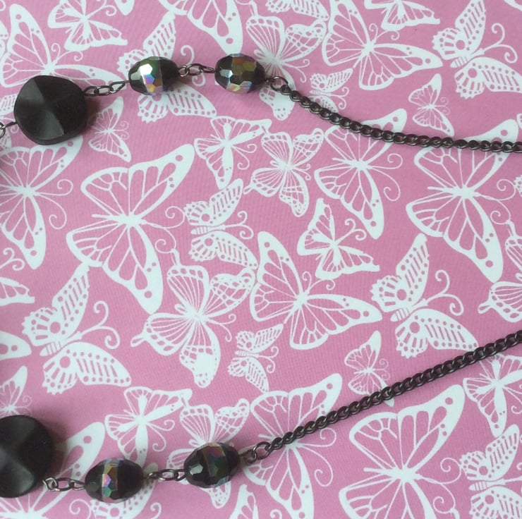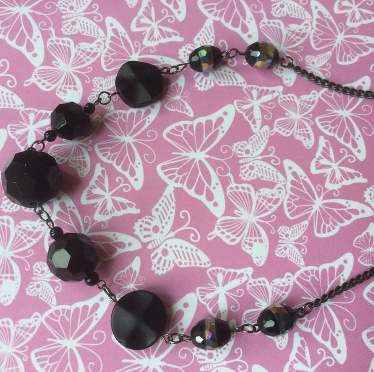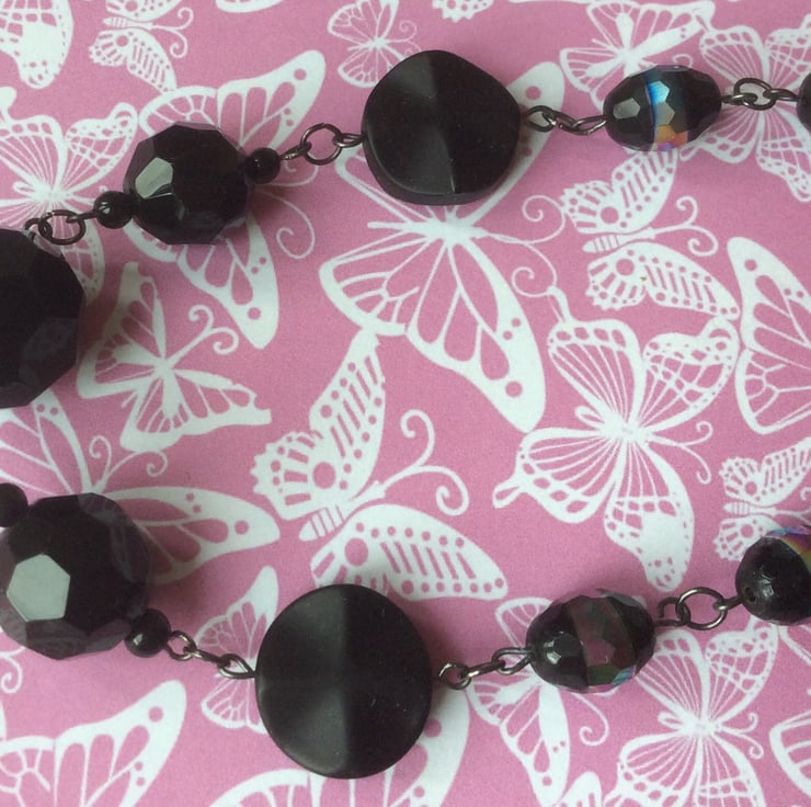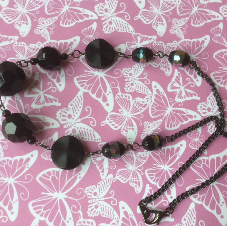 Made using a selection of round, oval and flat glass beads, attached to black tone chain with a lobster clasp.