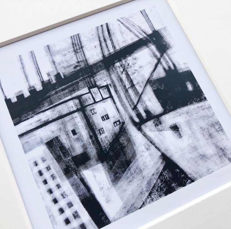 This monochromatic illustration captures a stark, cold night. Abstract buildings with smoke streamed chimneys hints of life within the grey blocks. The river Clyde sits quietly in the distance and the occasional structure morphs between ship and home.