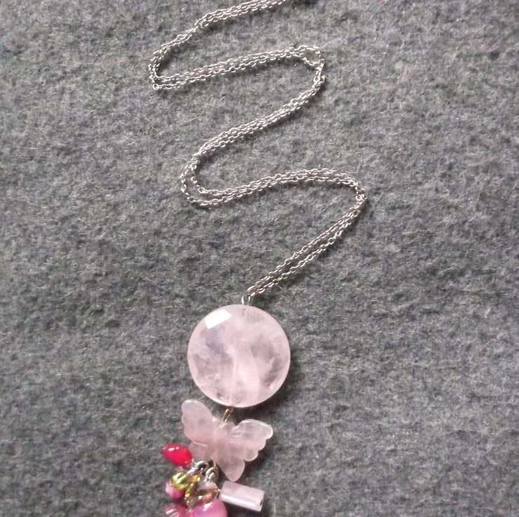 Rose Quartz Butterfly Long Necklace with a lilac Swarovski crystal, pink agate, and pink glass on a long sterling silver chain of 34 cm. Free gift box tied with ribbon. Only 4 have been made