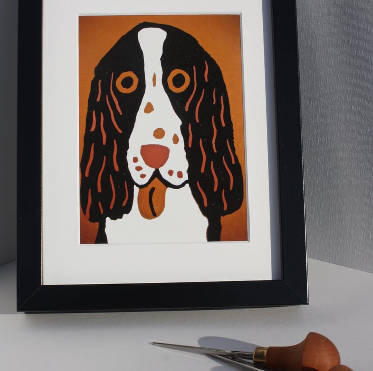 I produced a limited edition of this cute spaniel reduction linocut. I kept one for myself as I really like it and so have had it giclee printed on 308gsm archive quality Hahnemule Photo Rag paper.