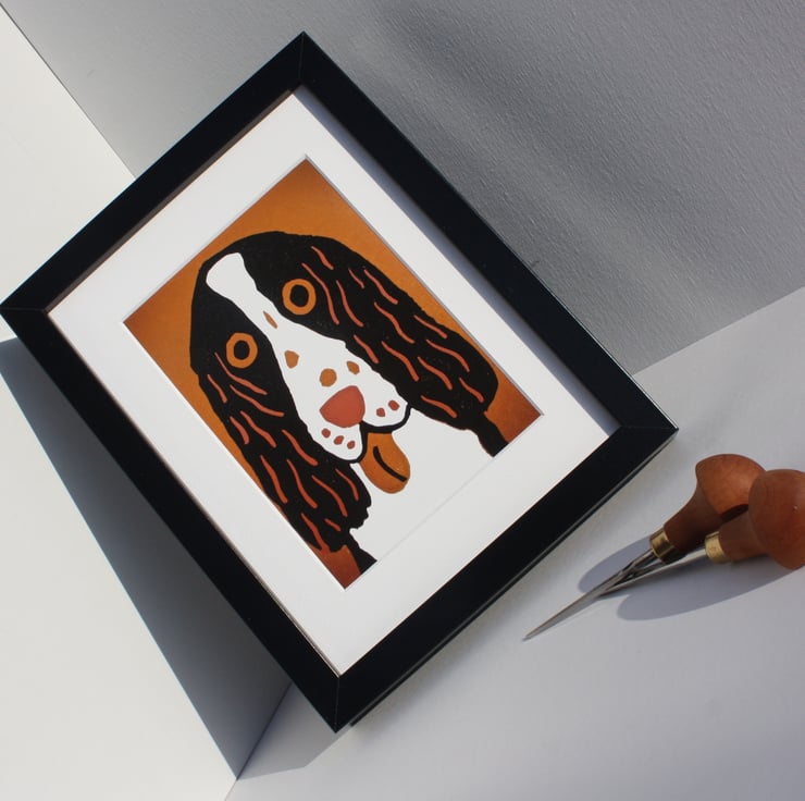 I produced a limited edition of this cute spaniel reduction linocut. I kept one for myself as I really like it and so have had it giclee printed on 308gsm archive quality Hahnemule Photo Rag paper.
