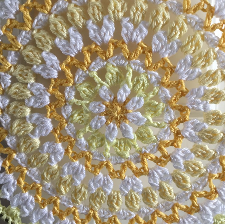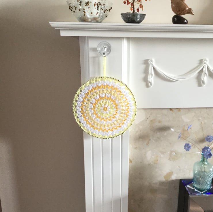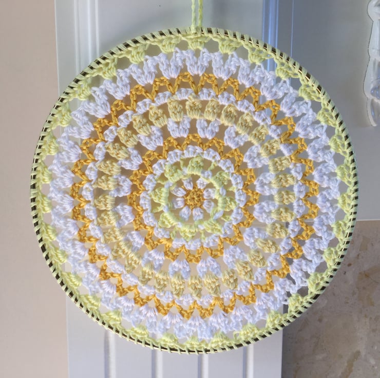 I have crocheted this lovely piece of wall art in 100% cotton yarn using white and 3 shades of yellow.