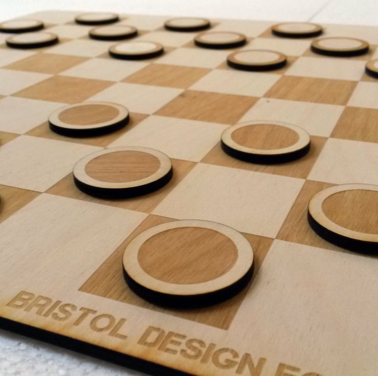 This minimal draughts set has been laser cut out of 4mm birch ply and hand-sanded finished. The board is 350mm square and the pieces are 35mm in diameter. It comes packaged in minimal packaging and the pieces come with their own simple storage so you never have to lose them.