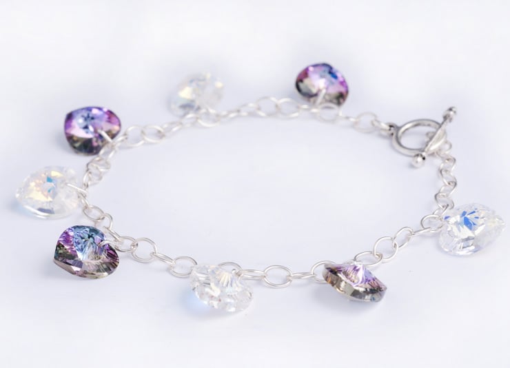 Clear AB and Lilac Swarovski Crystals Charm Bracelet on a sterling silver chain. Measures approx 7.5 inches but can make a shorter or longer length, please ask us. Matching earrings and pendant sets are available. Also available in other colours, just enquire! Free postage and free gift box tied with ribbon.