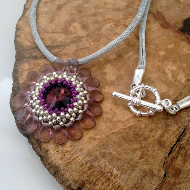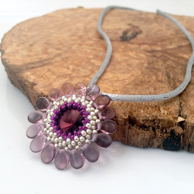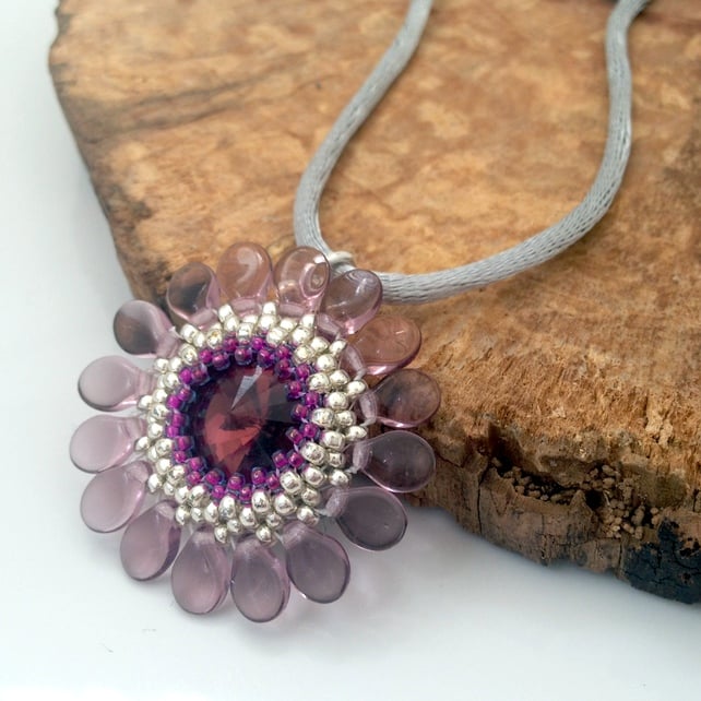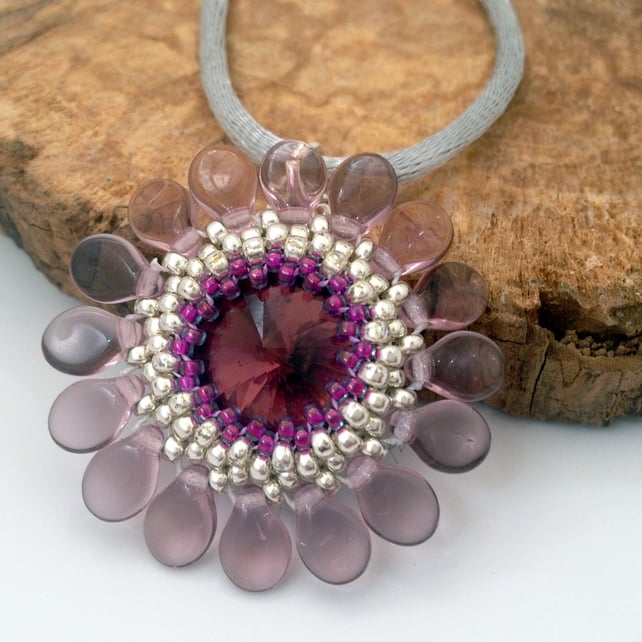 The pendant has been created by encasing a 14mm crystal rivoli with seed beads. Very light purple pip beads have been added to make the petals of the flower. All the beads have been hand sewn together to create this delightful pendant.