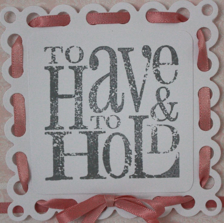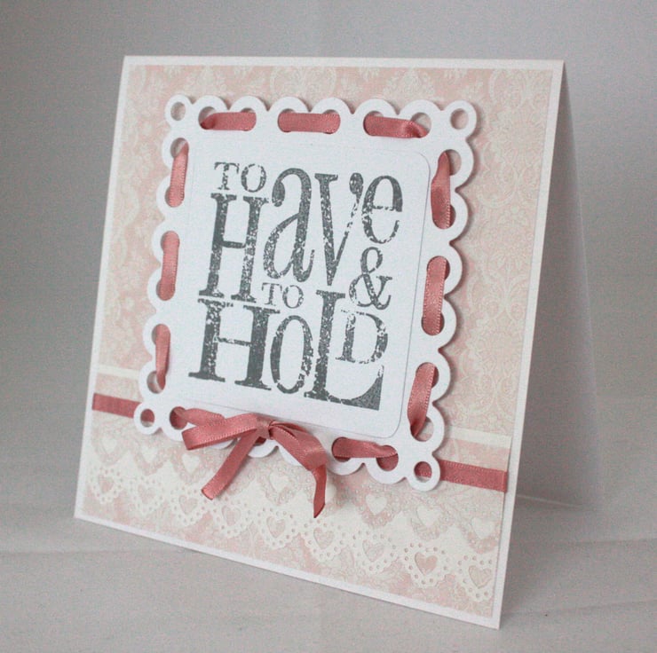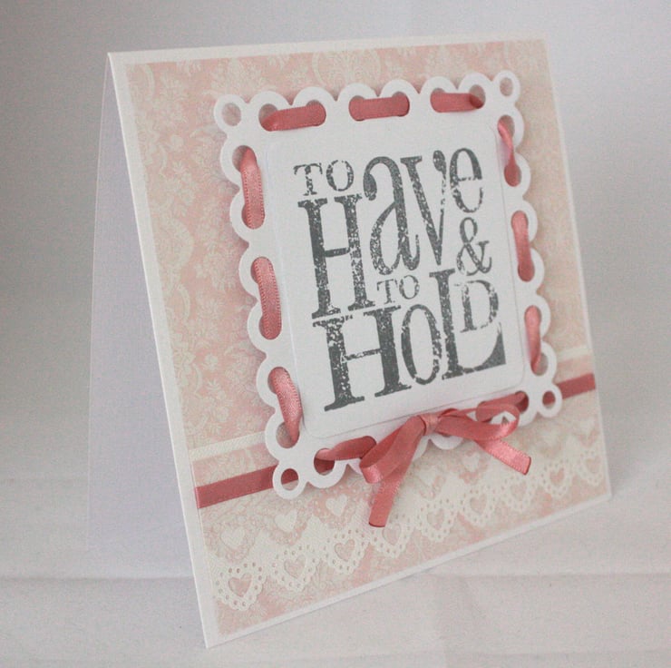 Handmade wedding card featuring the phrase 'To Have and to Hold' stamped using dark grey ink. The phrase has been layered onto a die cut frame with pink satin ribbon woven through the frame.The frame has been mounted onto pale pink patterned background paper using adhesive pads for a 3d effect.