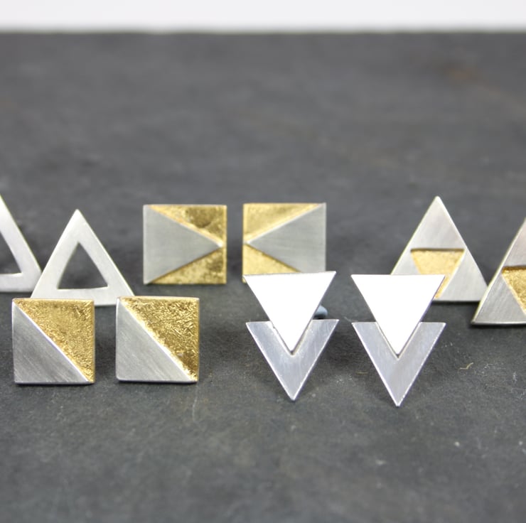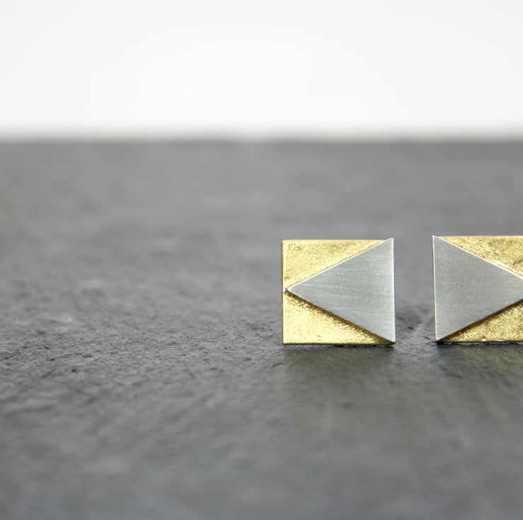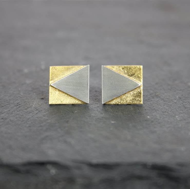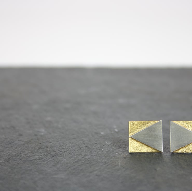 Handmade small studs made from hand cut silver sheet and 24ct gold leaf. Delicate earrings made from 1cm squares of silver with a silver matte finished triangle soldered on top and gold leaf in the recesses either side of the triangle.
