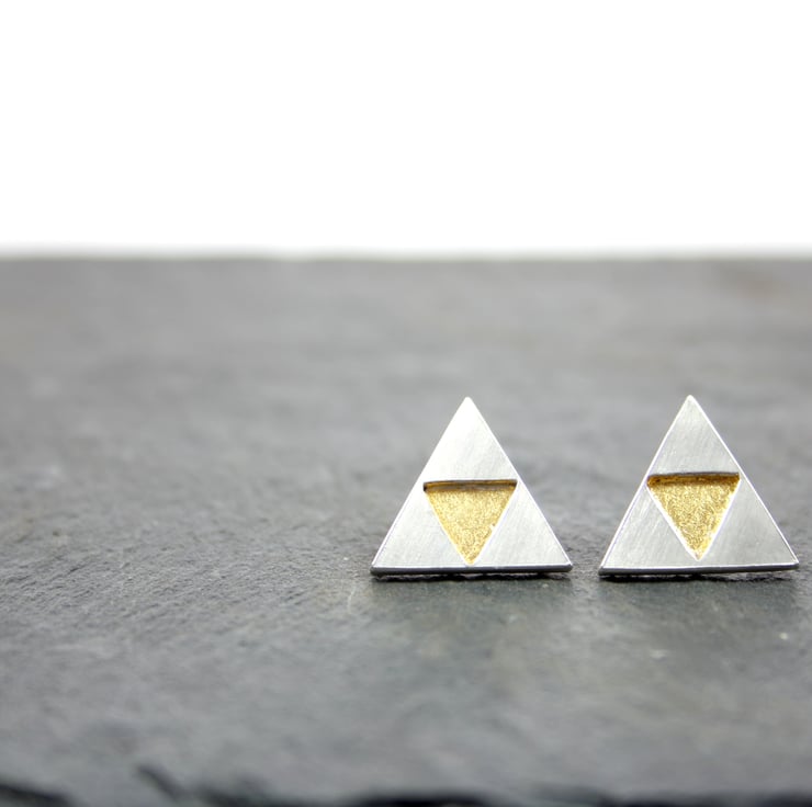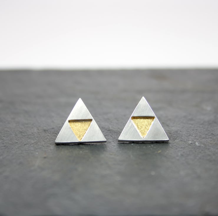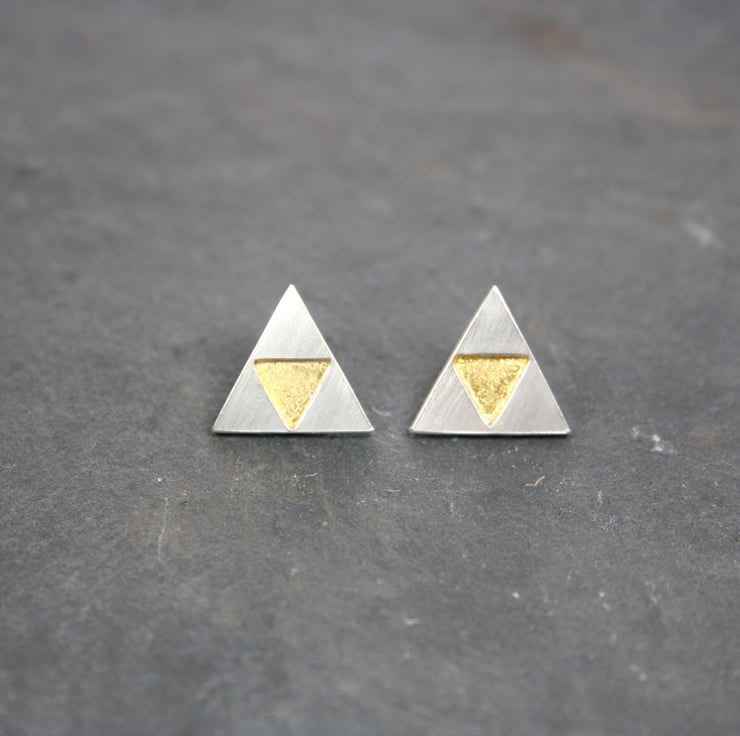 Handmade from two pieces of silver sheet hand cut into triangles and soldered together. The top triangle has a triangle cut out of the centre and has been filled with gold leaf and the silver has a matte finish. These delicate earrings measure about 1.5cms and go with anything.