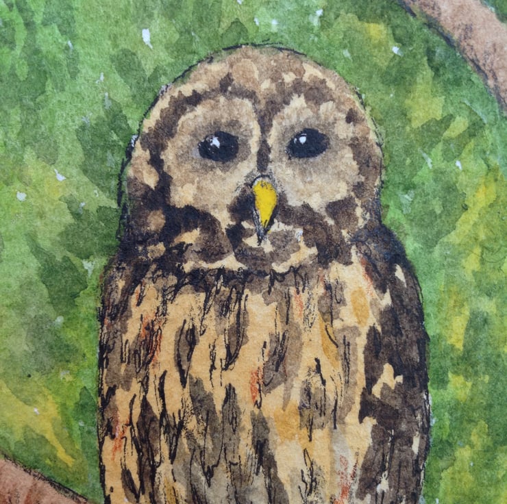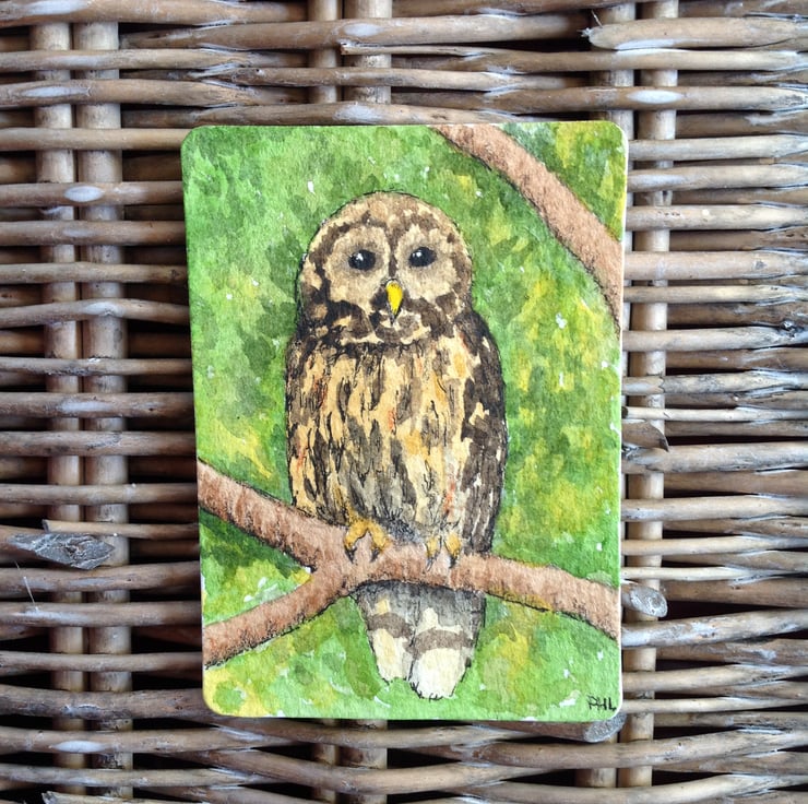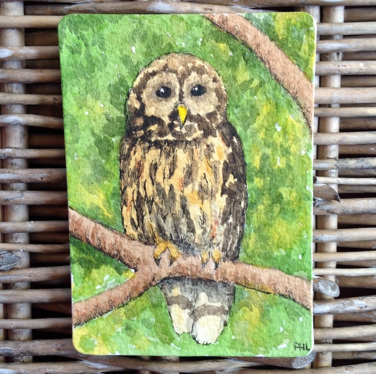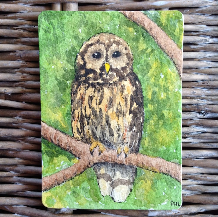 An original watercolour ACEO of an owl sitting on a branch, nestled in the foliage of a garden tree.