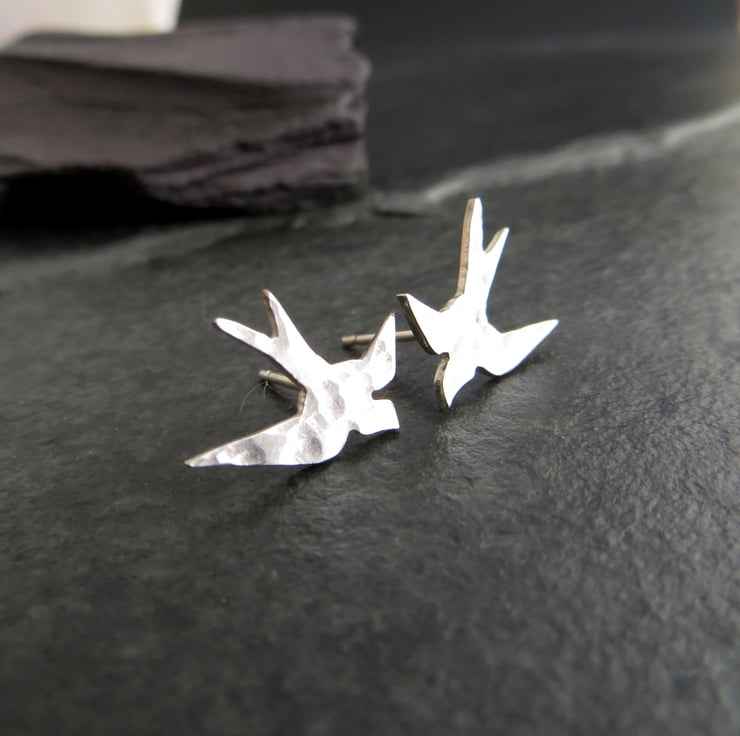 Sterling silver swallow earrings hand cut from silver sheet, textured with a dimple pattern and soldered to sterling ear posts. They are polished to a high shine and come with silver butterfly backs.