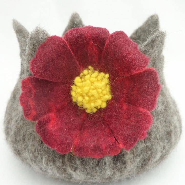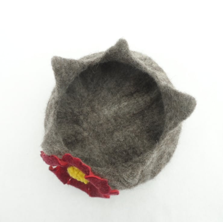This bowl or pot has been hand felted using a blend of natural shades of grey, black and white jacob wool. It has been felted over a resist which has been cut open in a starburst formation giving a decorative edge to the top. A hand felted red flower with yellow centre has been added.
