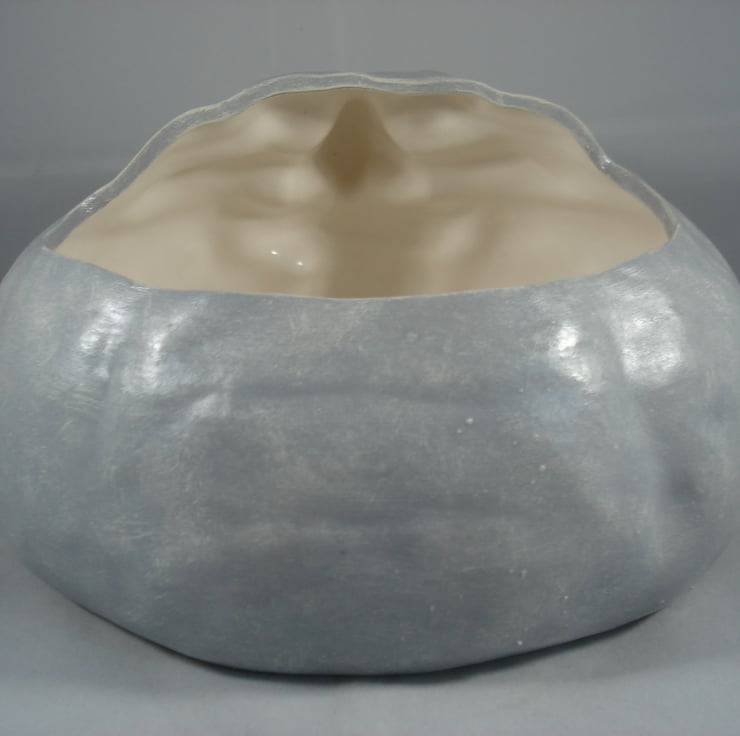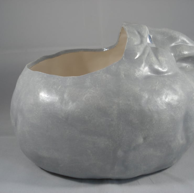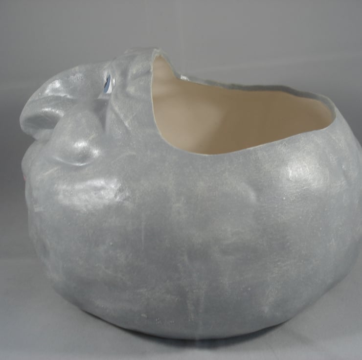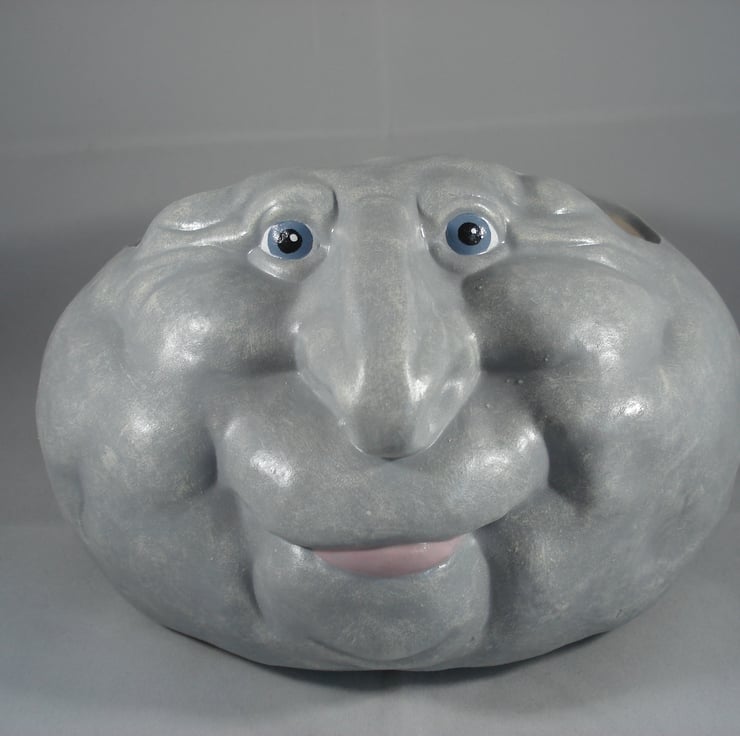I have for sale a novelty ceramic plant pot, which was hand painted by myself. It is in the shape of a grey coloured piece of rock or stone, with a face on the front of the pot. The back part looks like it has been hollowed out. This pot has no drainage holes in the bottom, so it could be used indoors or out. This would make a fun and novel addition to anyone's home or garden, or perhaps given as a gift.