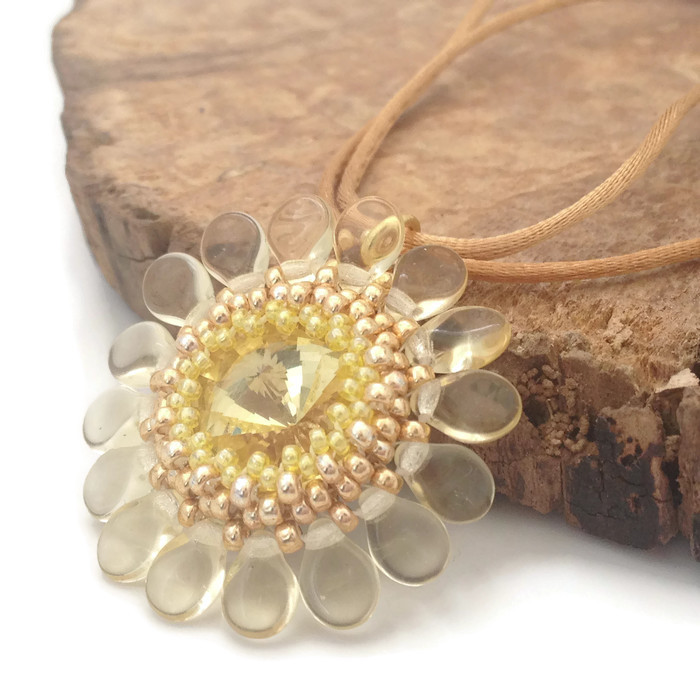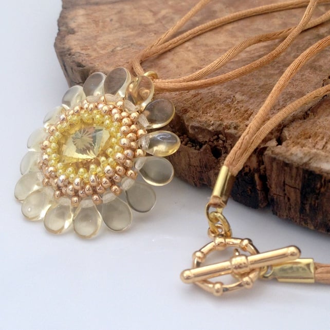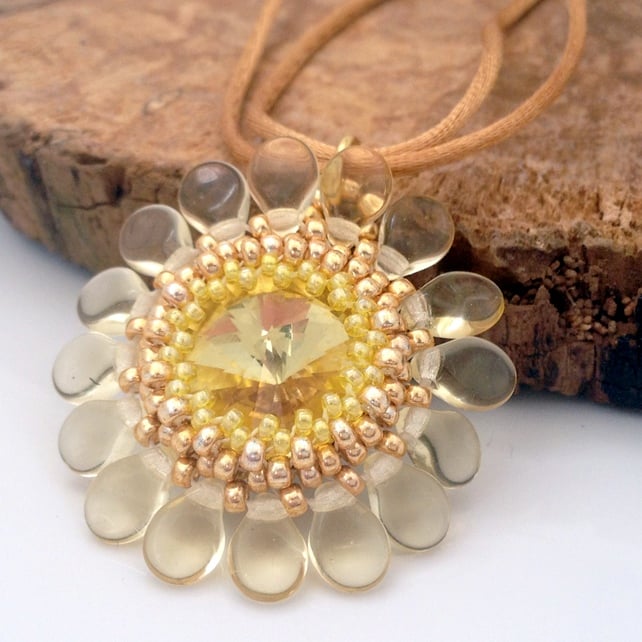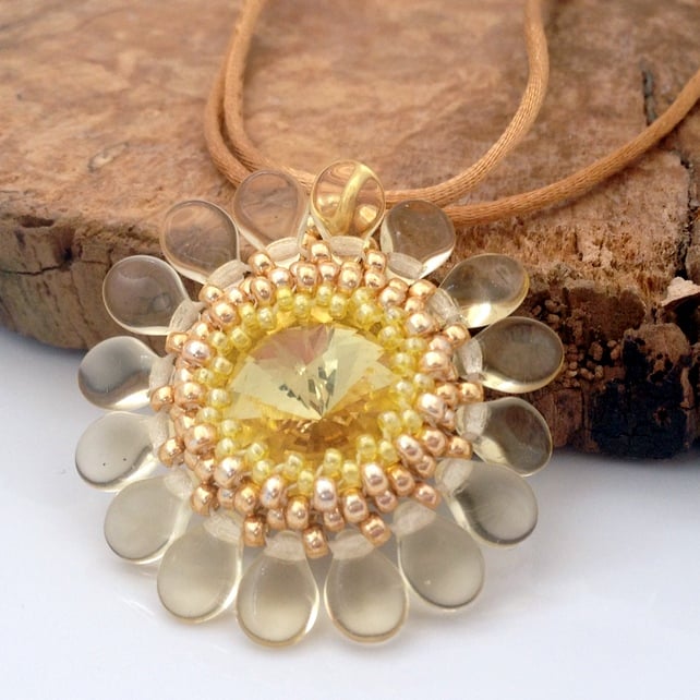 The pendant has been created by encasing a 14mm yellow crystal rivoli with seed beads. I have then added honey coloured pip beads to create the petals on the flower. The completed pendant measures approximately 3cm (1 3/26").