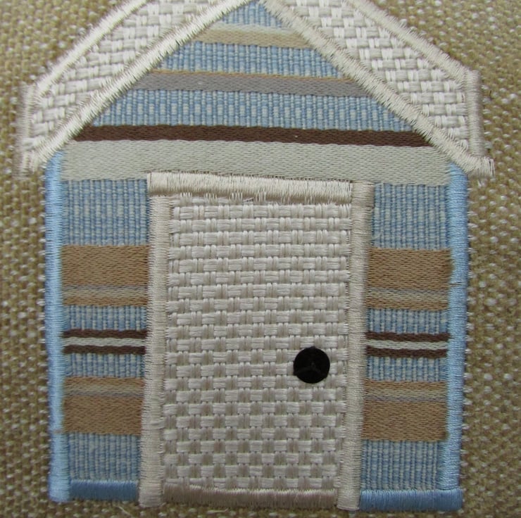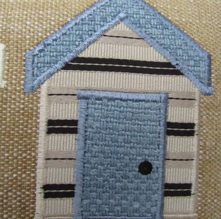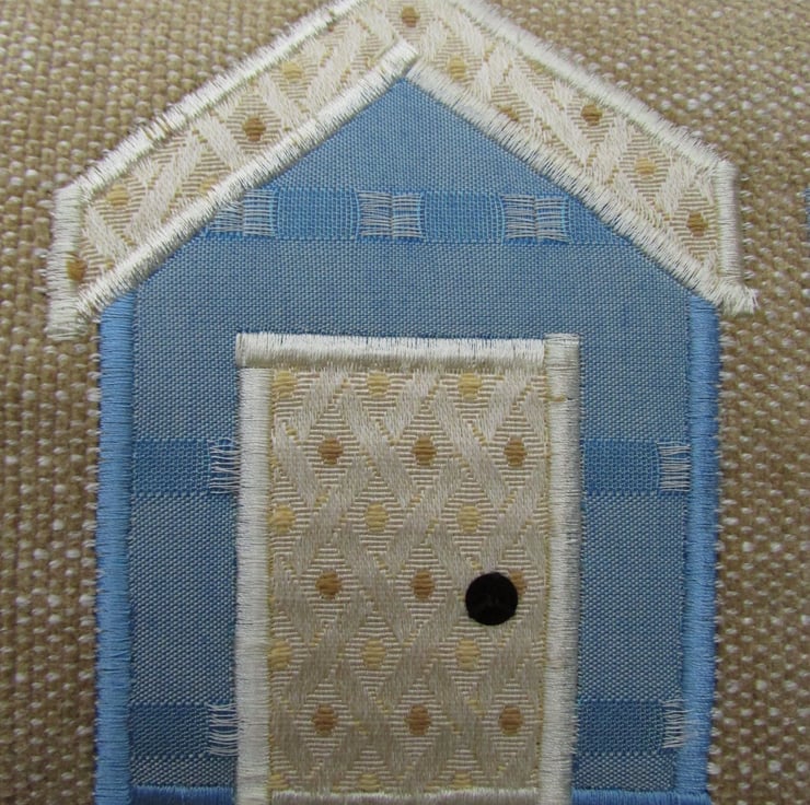 A rectangular cushion in a warm sandy beige fabric with three appliqued beach huts. The fabrics used for the beach huts are of various patterns and textures in shades of blue, cream, brown and black. The doors are embellished with black sequin handles.