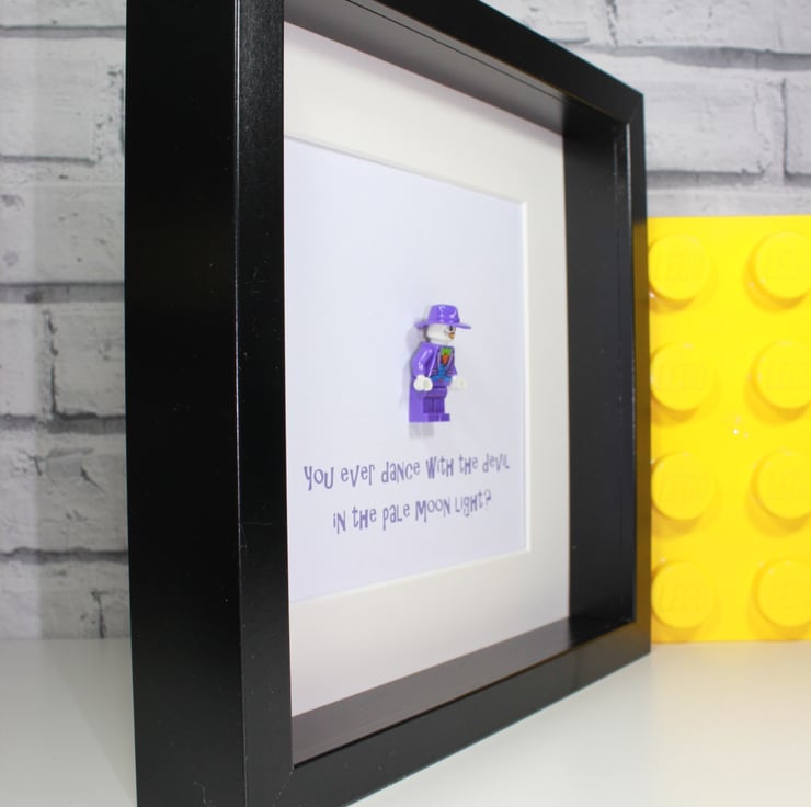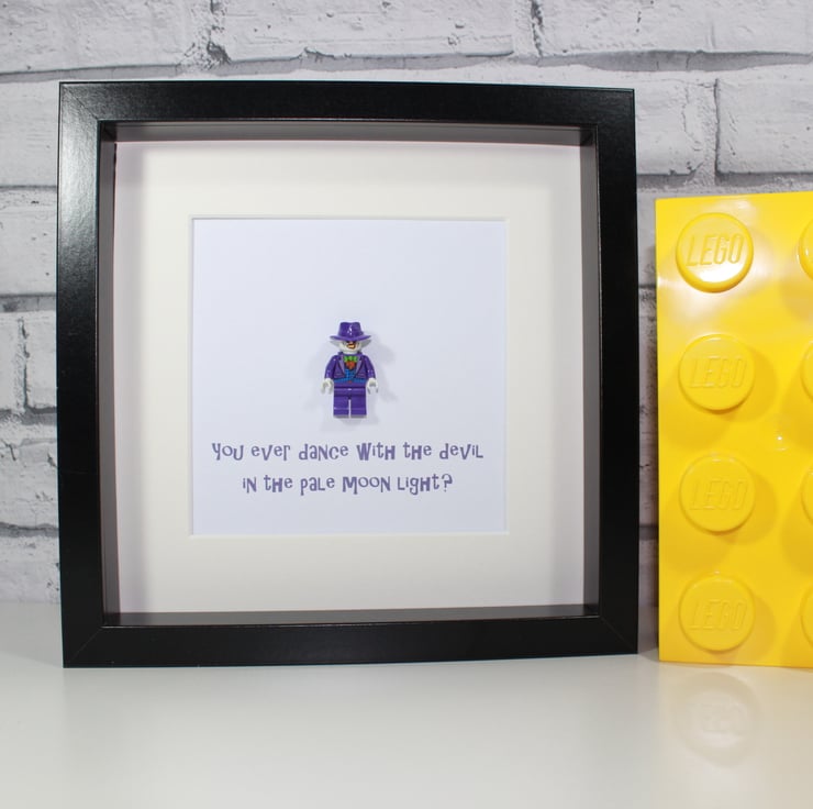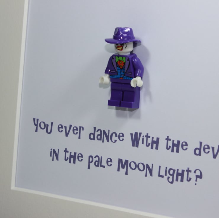 As a tribute to Tim Burton's Batman of the late 1980s we have framedup a mini version of Jack Nicholson as The Joker, featuring his famous quote "You ever dance with the devil..."