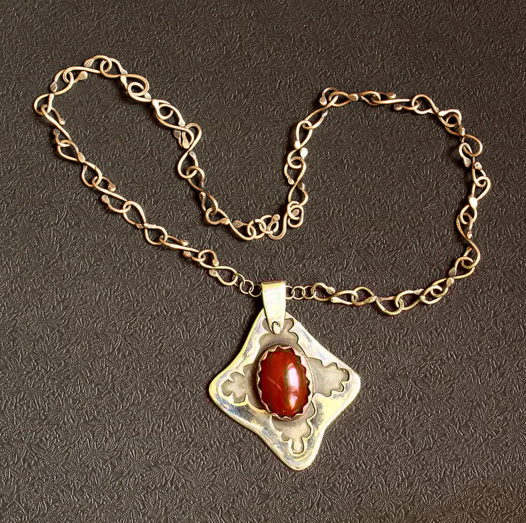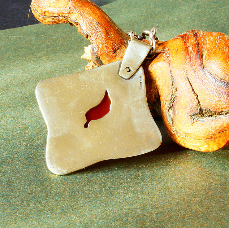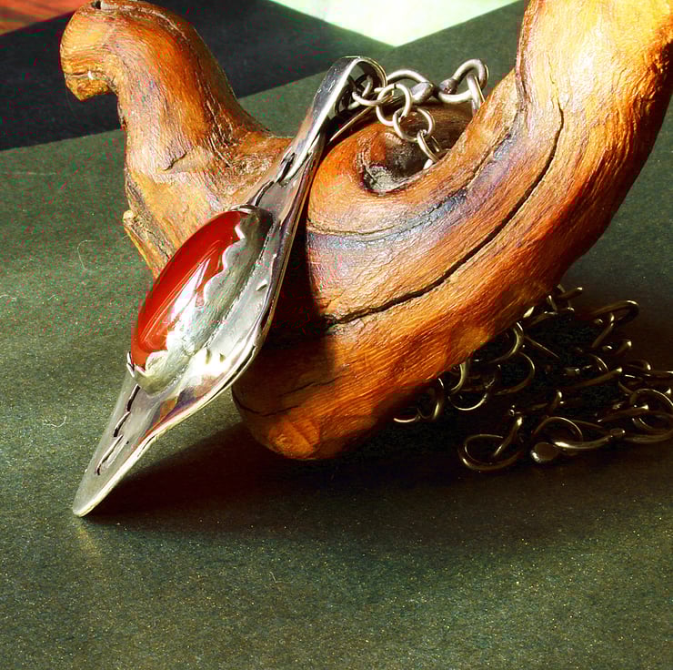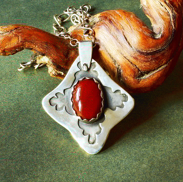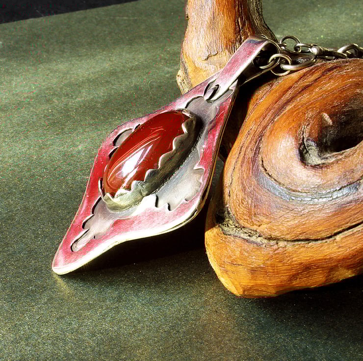 The beautiful deep cherry coloured stone is a polished Carnelian, said to give strong protection against the evil eye. It is 1" (2.5cm) long in a patterned setting of sterling silver.