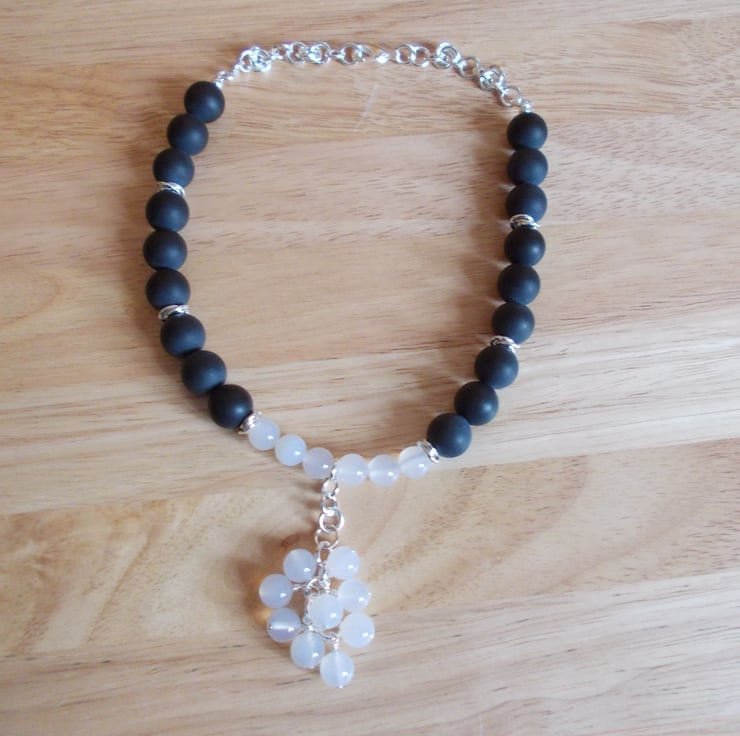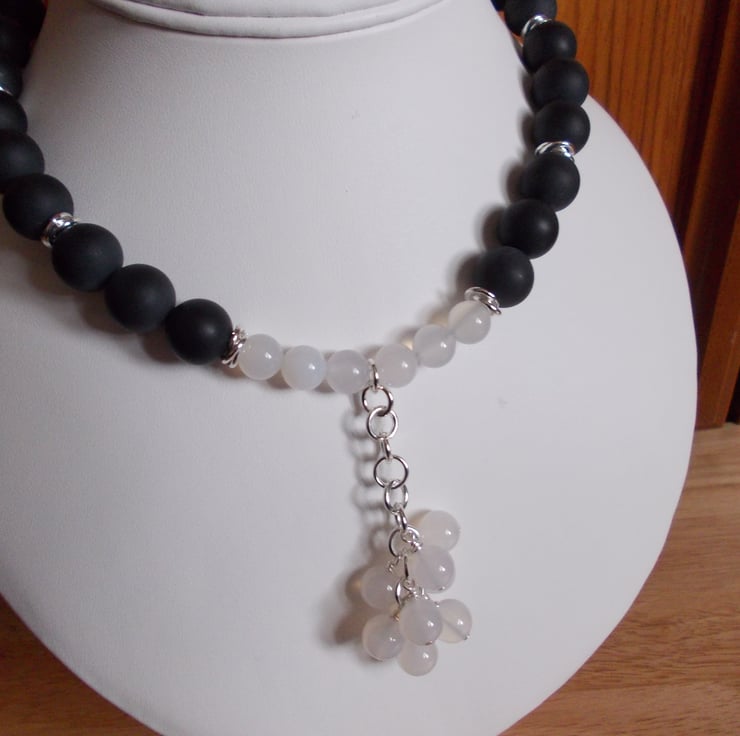 This 15 inch necklace feature frosted black agate rounds with complimentary white agate feature stones and drop pendant.