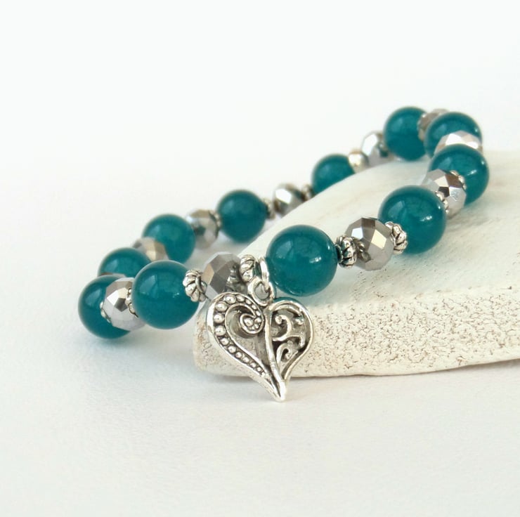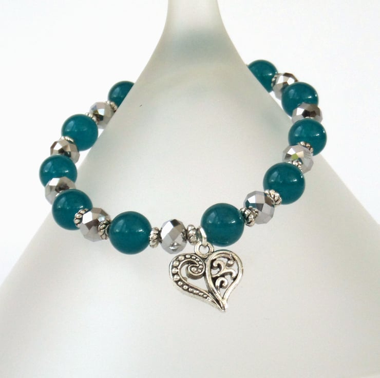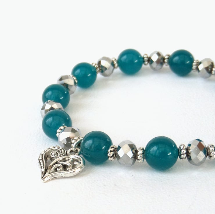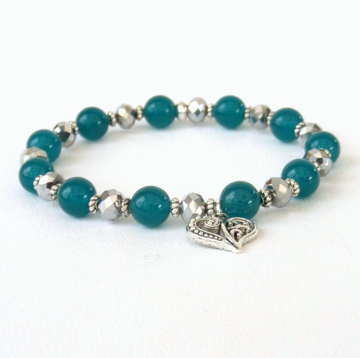 Lovely teal coloured jade and contrasting silver crystals combine to make these pretty and sparkly bracelet.