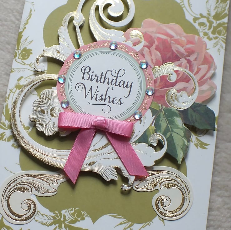 A stunning 3D effect, collaged birthday card, handmade with Anna Griffin designer card stock. Embellished with co-ordinating, die-cut ephemera, and satin bow. Approx. 5"x7" in size, and inside includes the sentiment, 'Happy Birthday'.