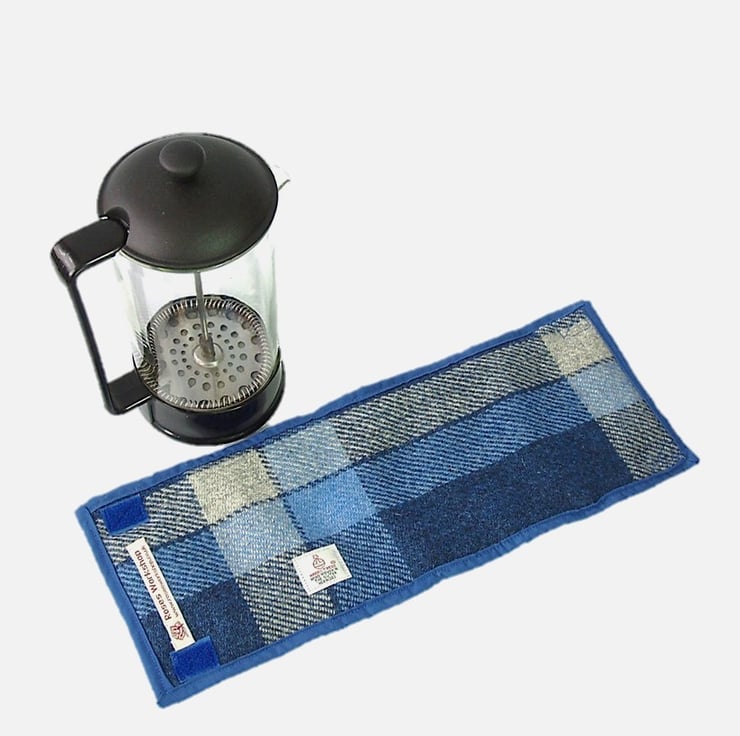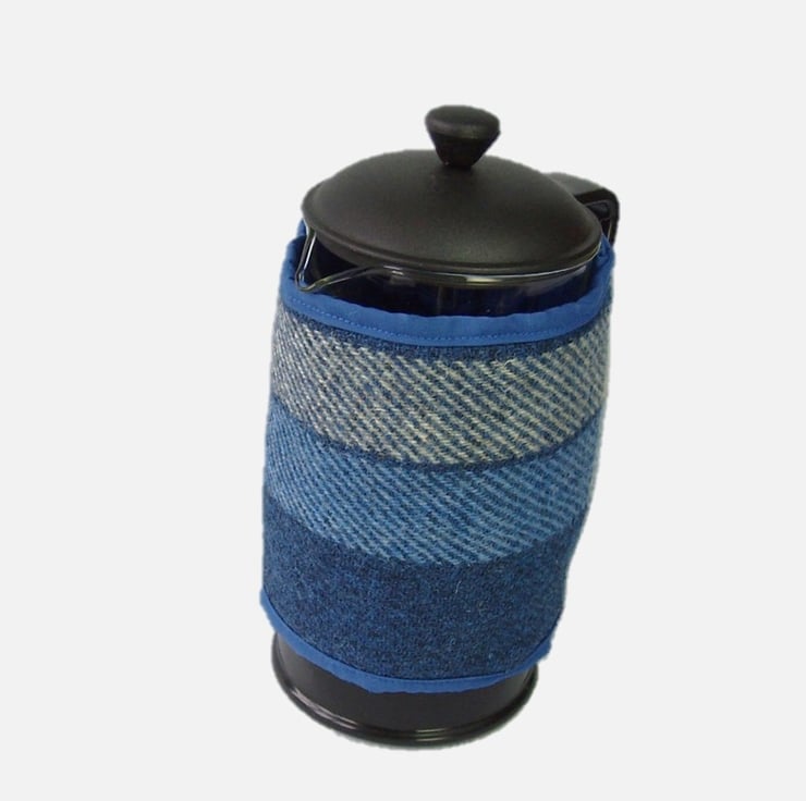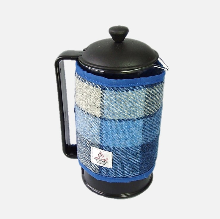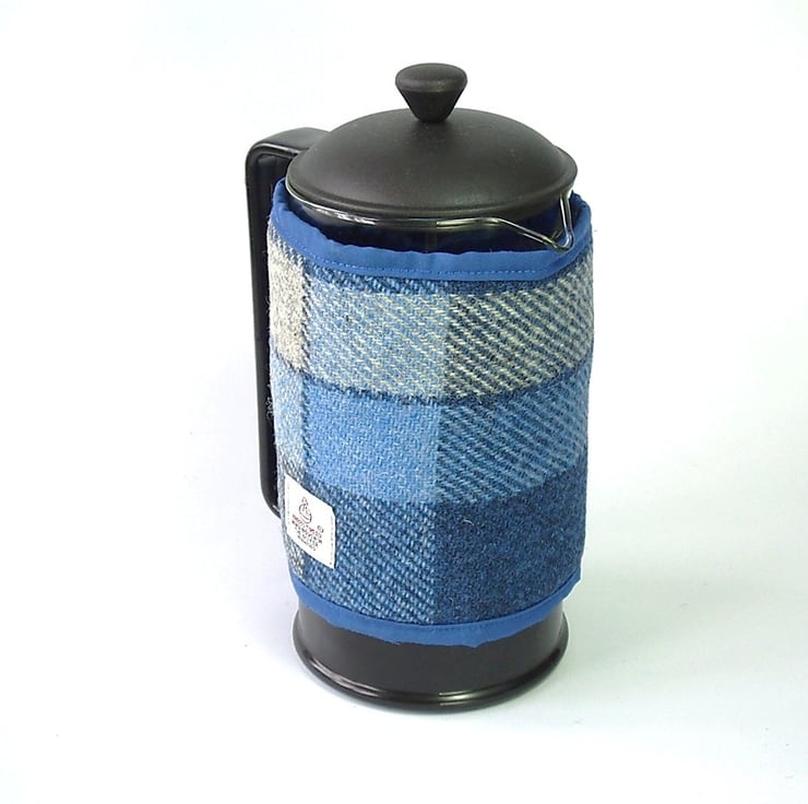 I have made this beautiful quality cosy from the world renowned Harris Tweed handwoven fabric in a bold blue and white check. It is lined and edged in toning cotton fabric, and wadded with polyester to keep your coffee warm. The Orb label, your guarantee of authentic Harris Tweed fabric is proudly displayed.