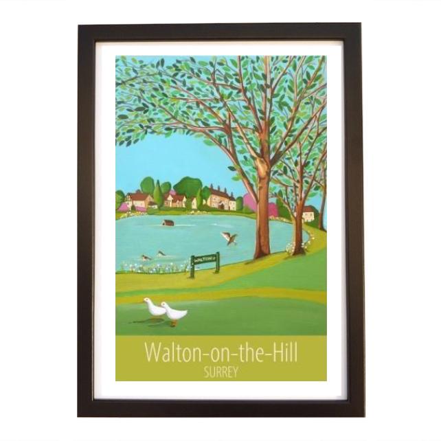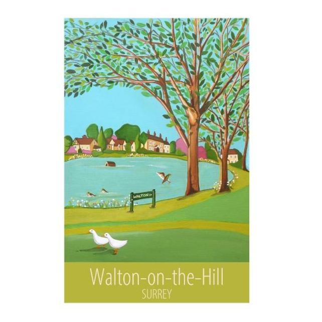 A contemporary travel poster style print of ducks on the pond in picture-postcard Walton-on-the-Hill village in Surrey, from my own original acrylic painting.