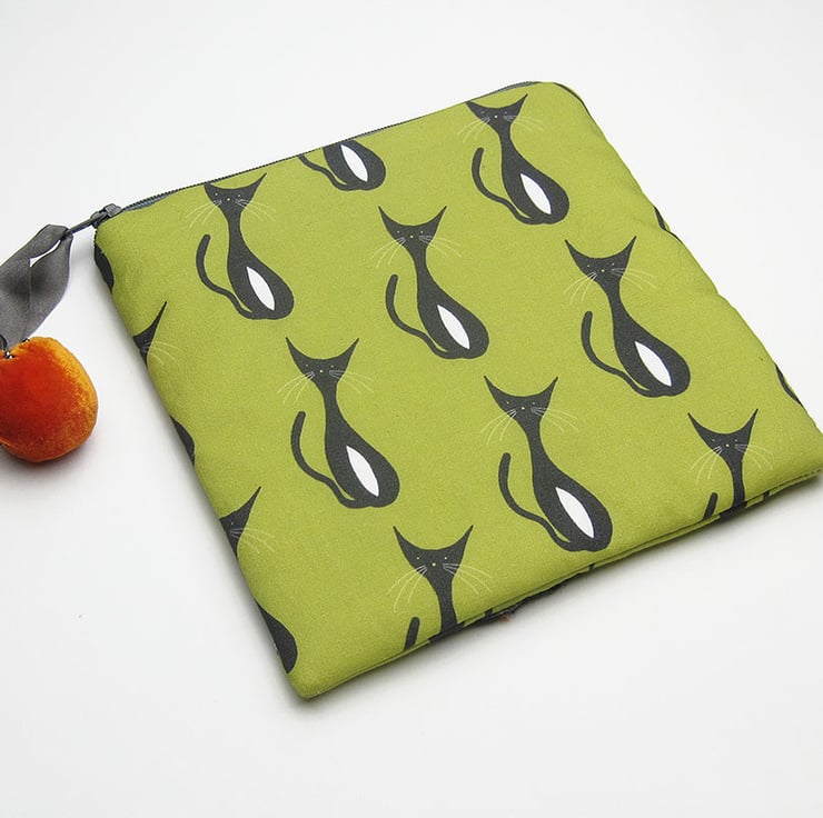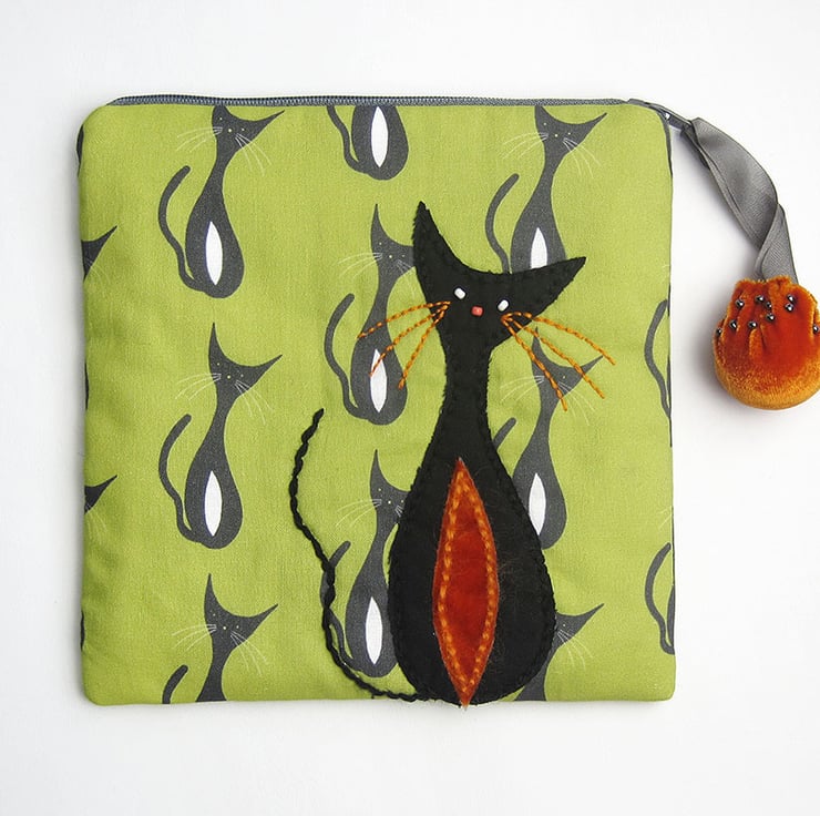 I have made this zipped make up bag/pouch in my own mid century inspired cat print design on cotton. The pouch also has a cat hand appliquéd on one side in black with an orange velvet tummy and whiskers. It is lined in up cycled scarf fabric. I have also added an orange velvet zip pull with grey silk ribbon. The bag measures 17.5cms(7 inches) in width by 17.5cms(7 inches) deep.