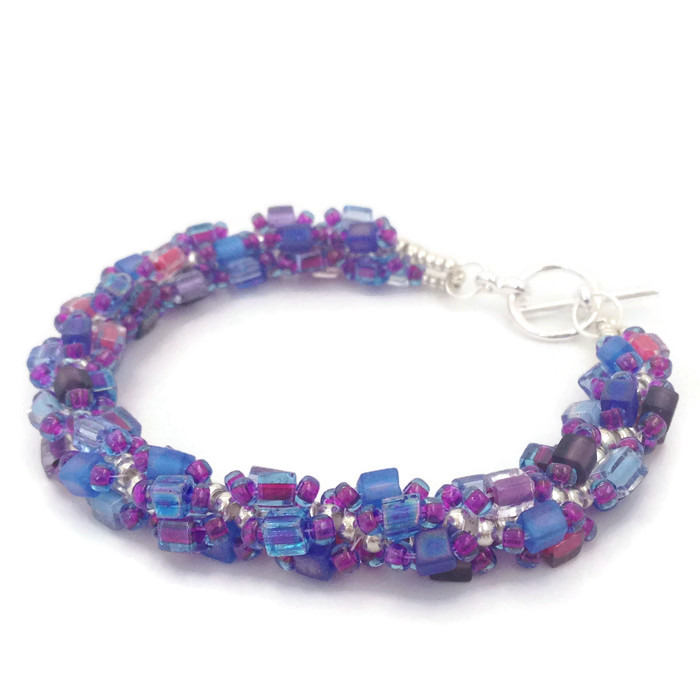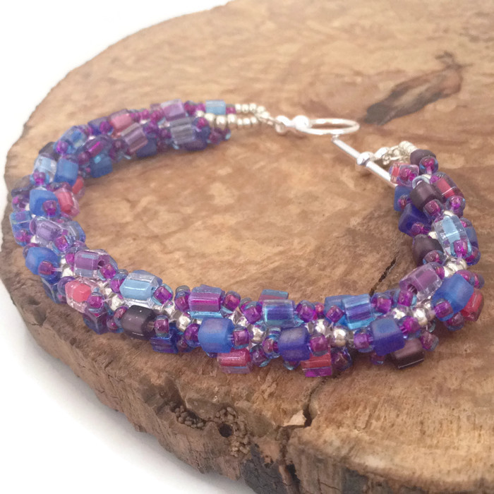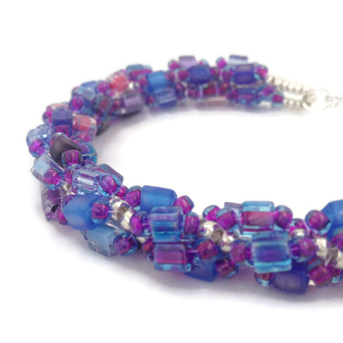 It has a silver seed bead core and features a berries mix of 4mm cube beads looping around the outside. I have added purple seed beads to the outside loops that compliment the mix of blues, purples and pinks.