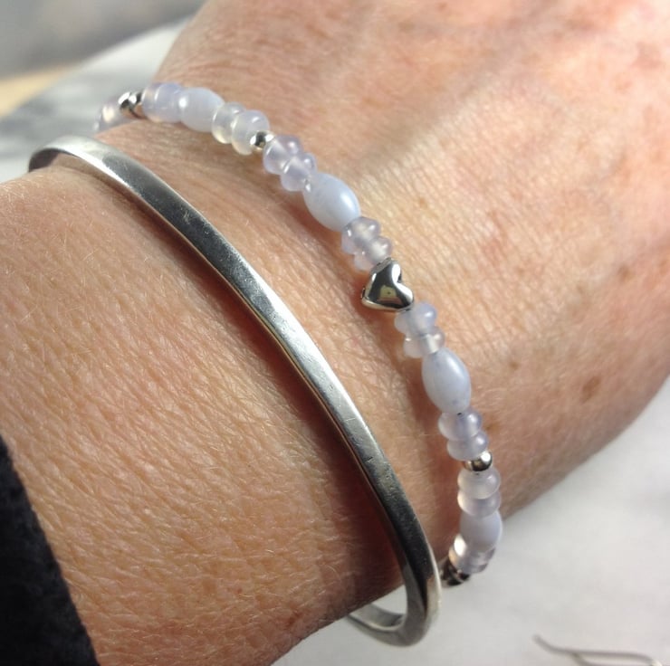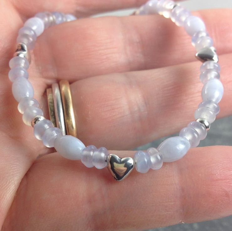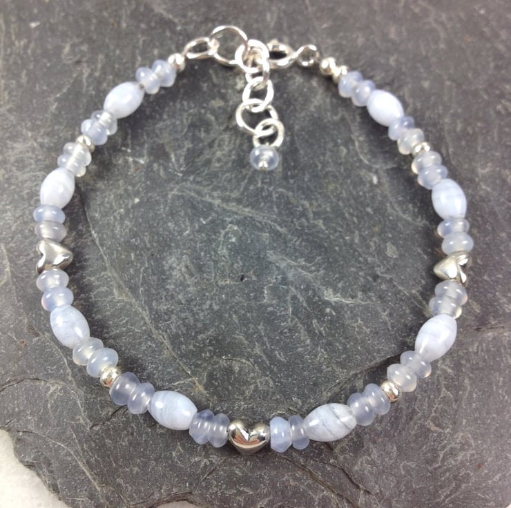 A pale blue, pretty, feminine bracelet with sterling silver heart beads.