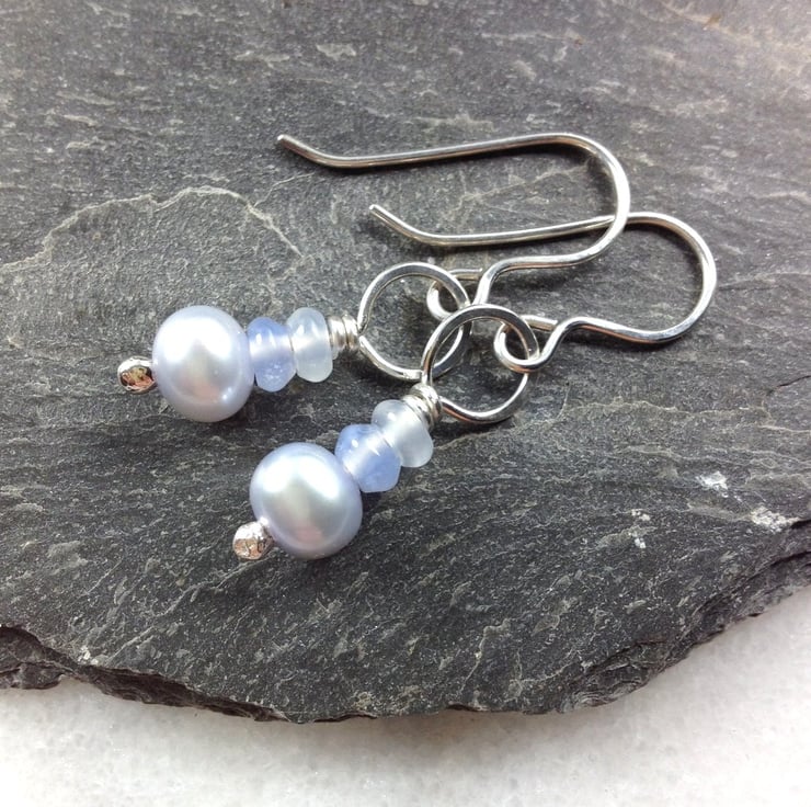 I have paired small blue lace agate barrel beads with handcut chalcedony lentils, they are interspersed with solid little silver beads and 3 sterling puffy heart beads.