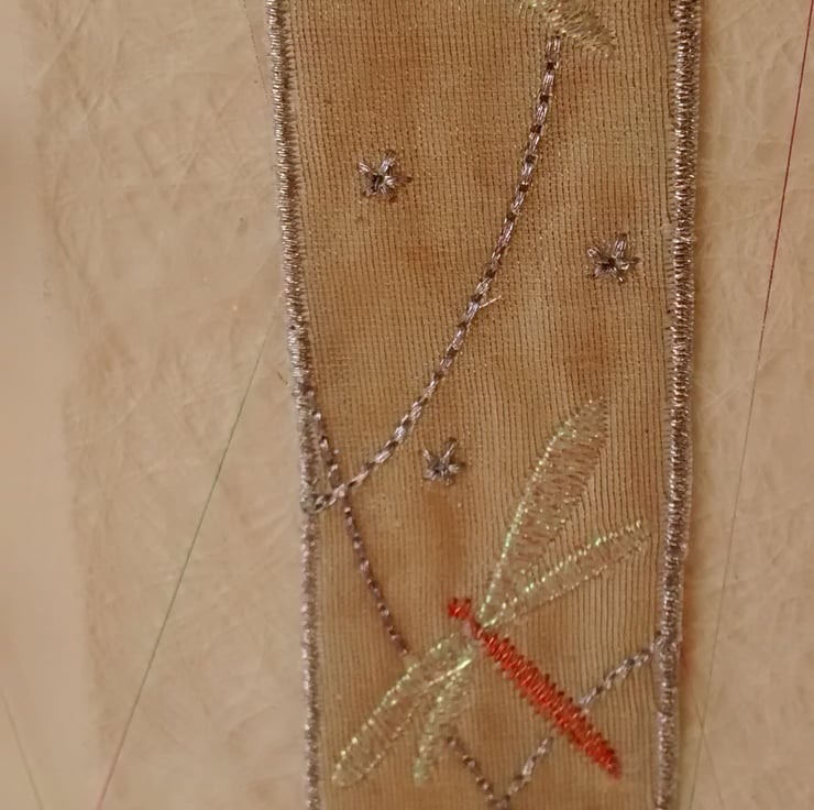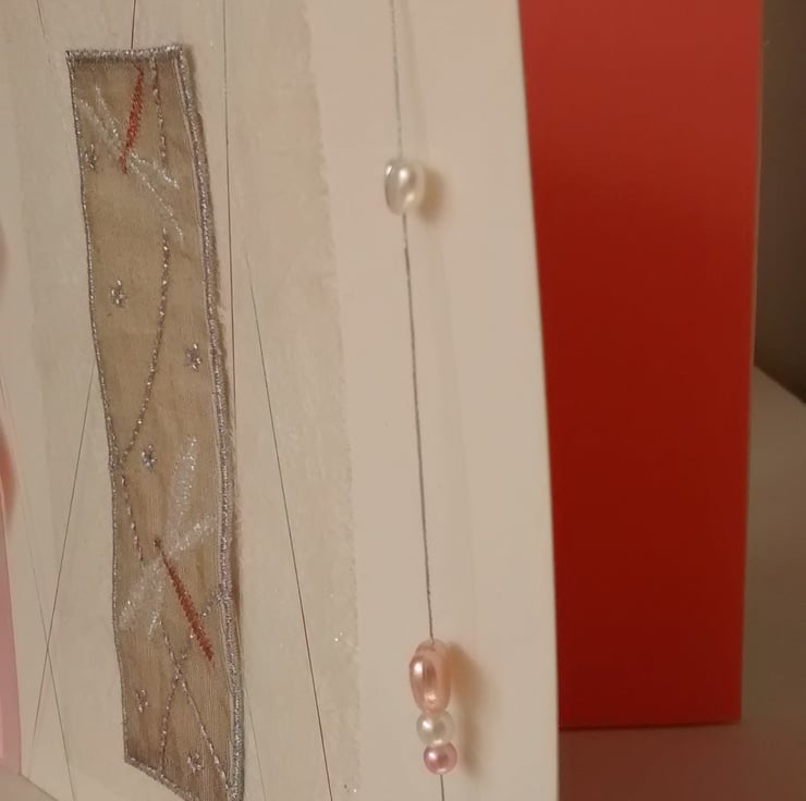 A completely handmade and individual designed card. Consisting of quality cream card which had a rectangle of ivory fairy hair, which has holographic thread wrapped around. Then a rectangle of fabric embroidered with dragonflies. On the right is acthread with heart and round shaped beads. Finished off with pastel pink ribbon and bow