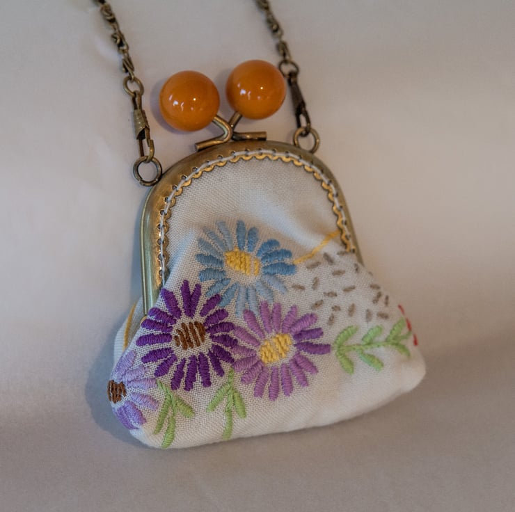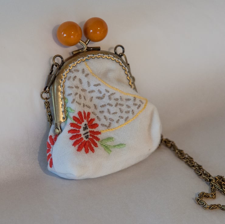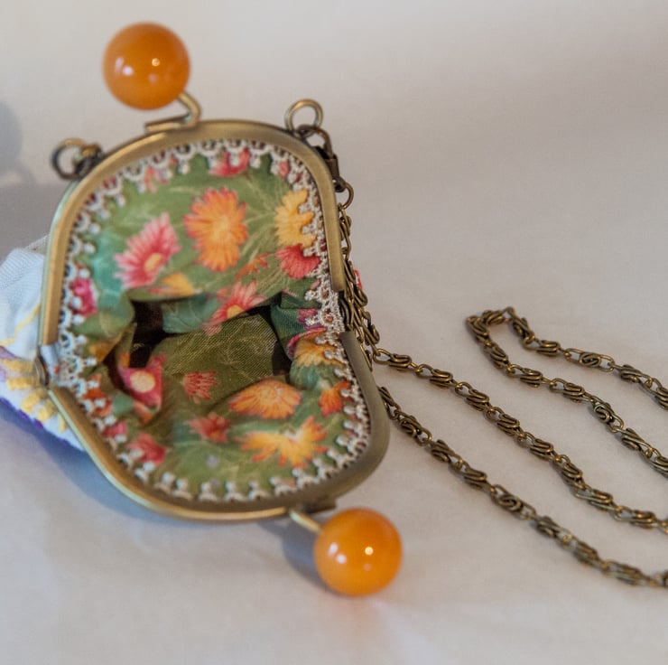 Sweet little kiss-lock purse featuring mustard yellow coloured resin ball fastening, detachable bronze coloured chain strap, and a lovely soft squashy shape. The purse is made from a recycled vintage embroidered tray cloth, and as such is different on each side. Lining is made from a bright floral cotton fabric and embellished with a lace trimming.