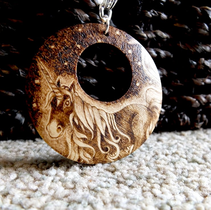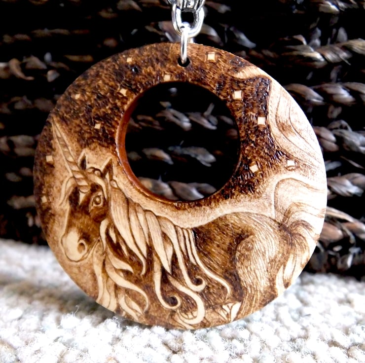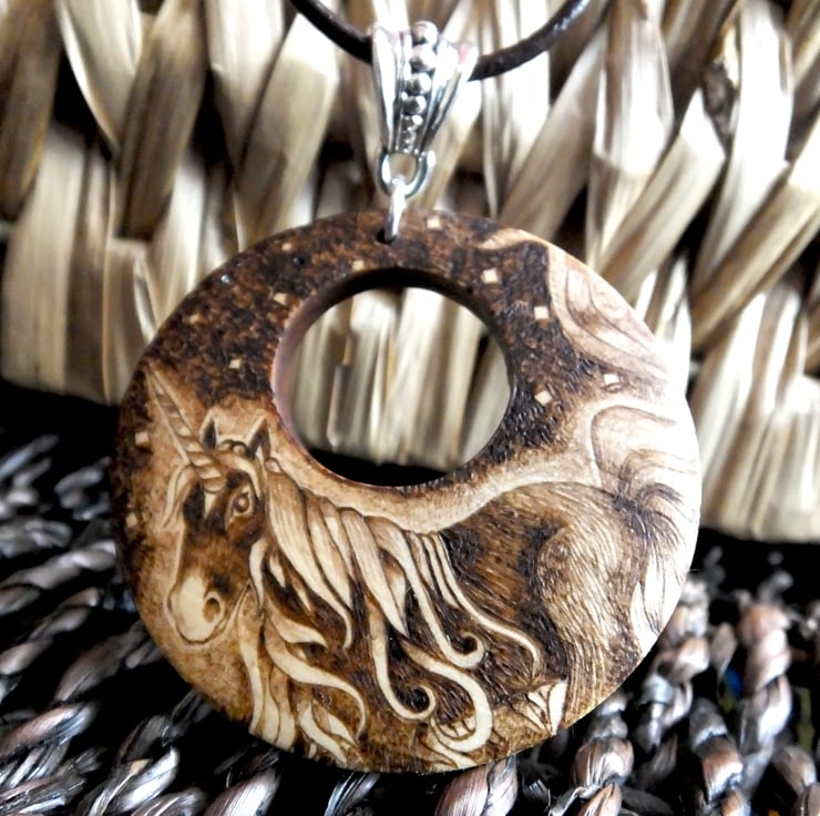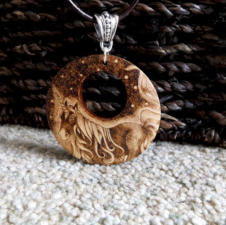 The design on this pendant is a unicorn under a starry sky, with a majestic mane and tail, check out the images. I try to photograph in different lights so you can get a feel for the piece.