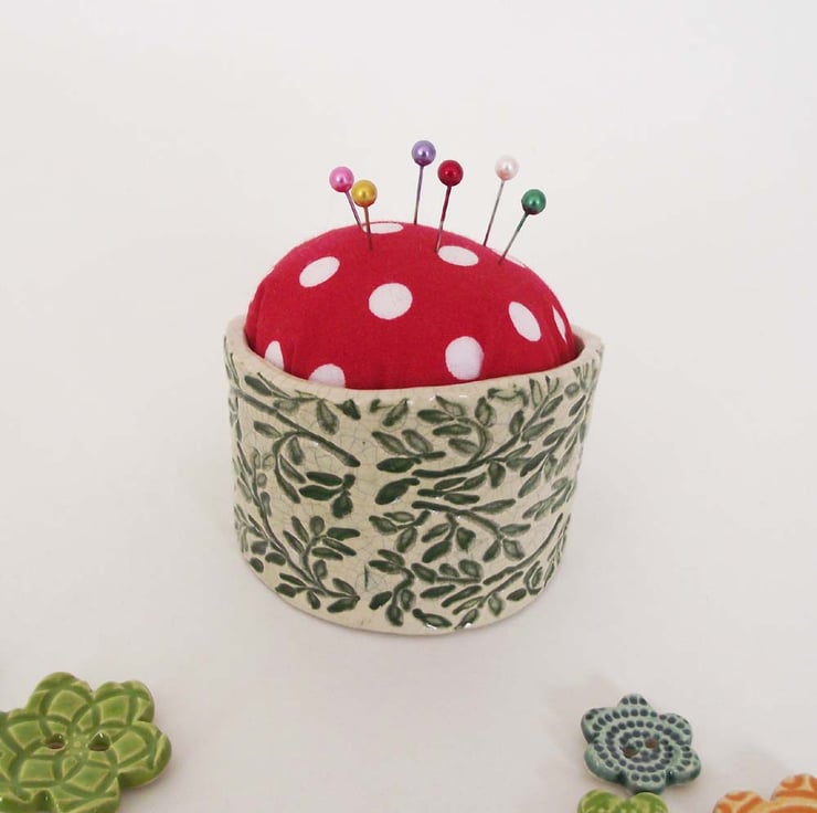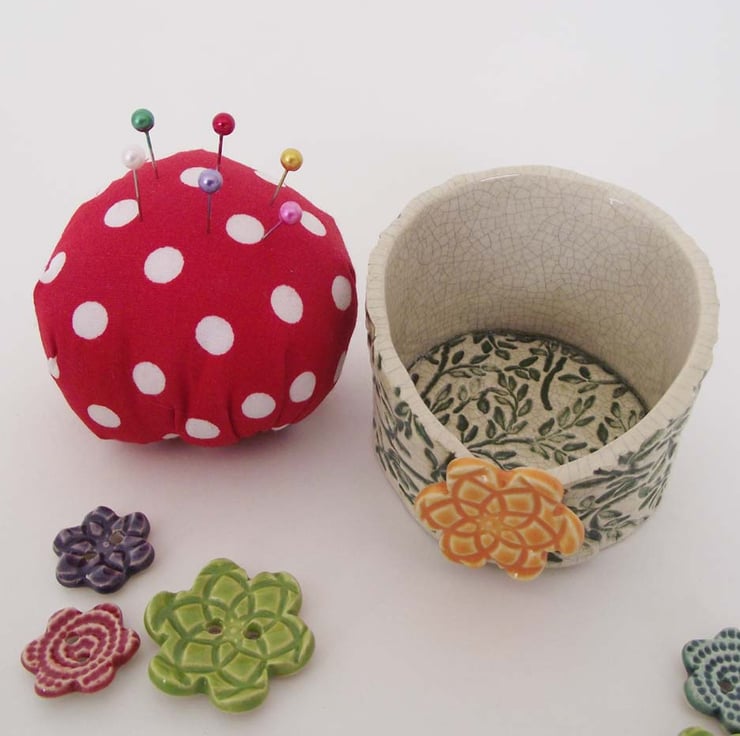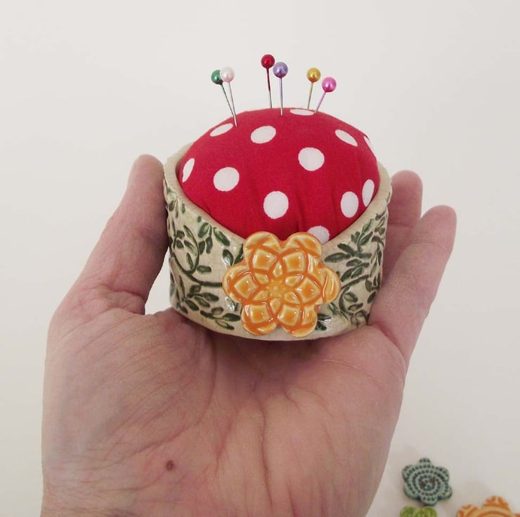 This cute little pincushion is made from white earthenware clay.