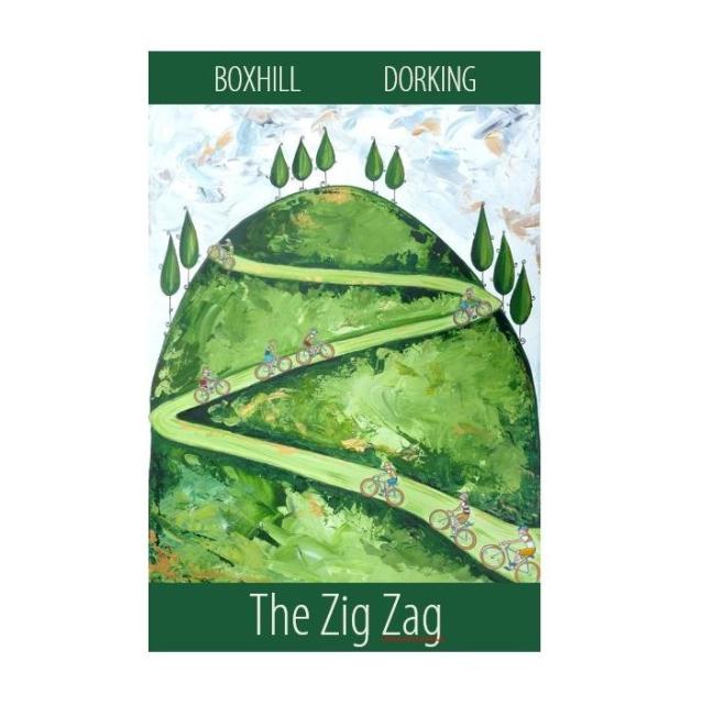 A beautiful A3 fun print of cyclists climbing the famous Zig Zag, Boxhill near Dorking, Surrey. This item is unframed.
