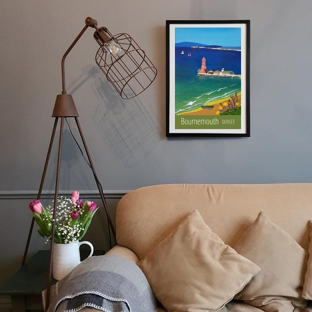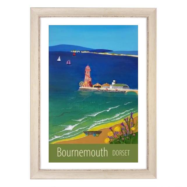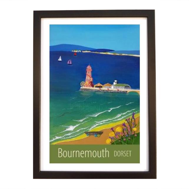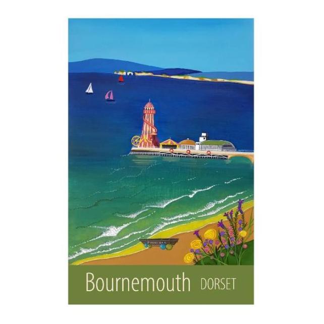 A contemporary travel poster style print of Bournemouth in Dorset, looking out to sea and the pier, from my own original acrylic painting.