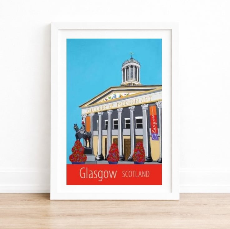 A contemporary travel poster style print of the Gallery of Modern Art in Glasgow, with the Duke of Wellington outside (with traffic cone!), from my own original acrylic painting. A perfect gift for those who love Glasgow!