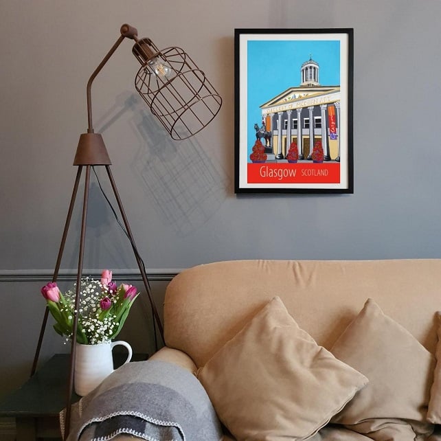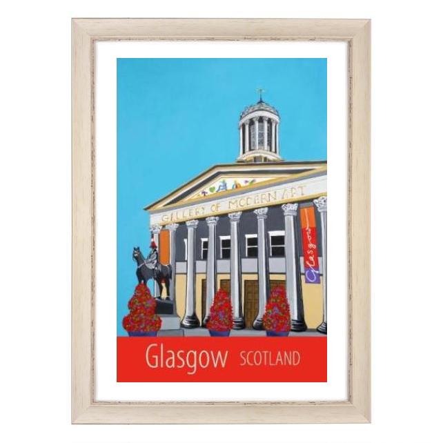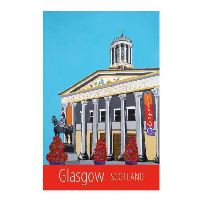 A contemporary travel poster style print of the Gallery of Modern Art in Glasgow, with the Duke of Wellington outside (with traffic cone!), from my own original acrylic painting.