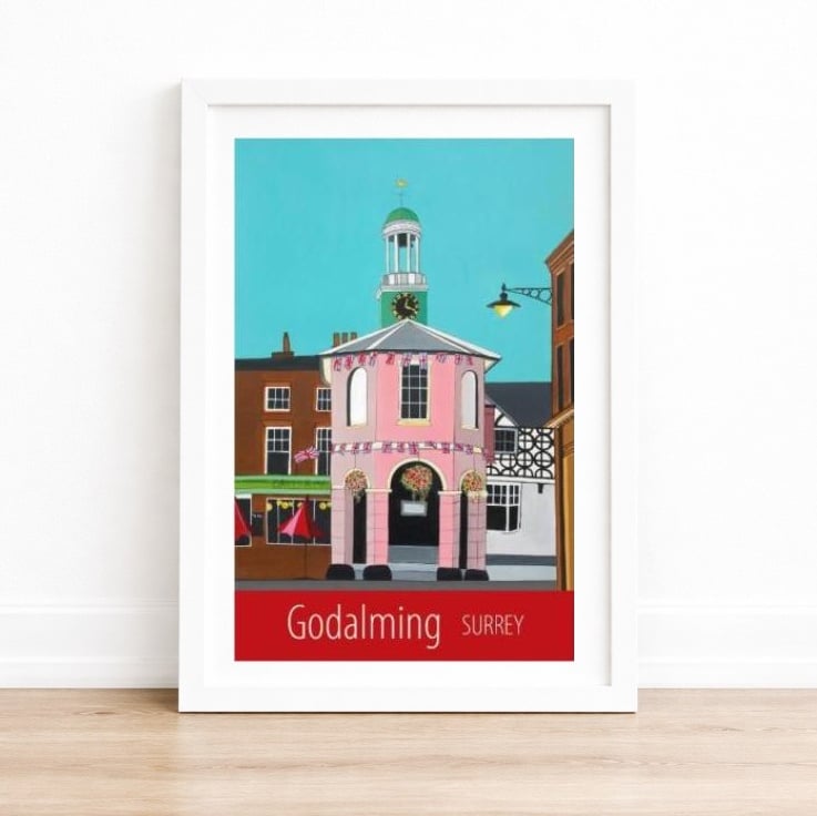 A contemporary travel poster style print of the Pepperpot on Godalming High Street, Surrey, from my own original acrylic painting. A perfect gift for those who love Godalming!