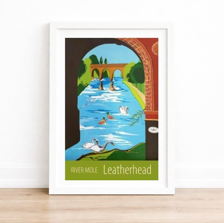 A contemporary travel poster style print of the River Mole as it winds its way through the Surrey town of Leatherhead, from my own original acrylic painting. A perfect gift for those who love Leatherhead!