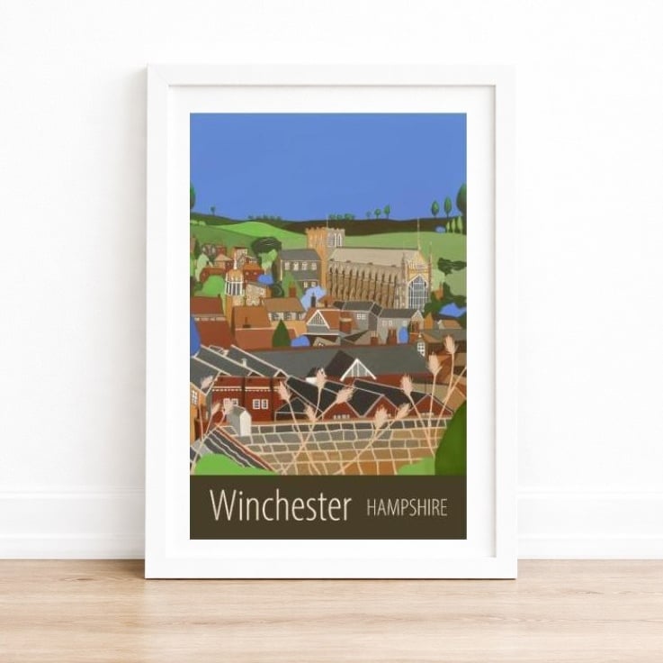 A contemporary travel poster style print of the view across the roofto A perfect gift for those who love Winchester!