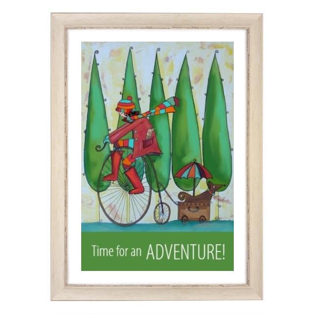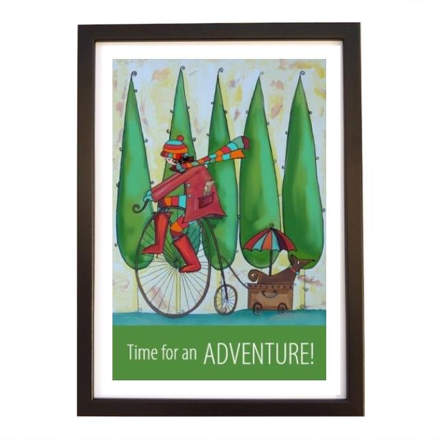 A beautiful A3 print. It's time for an adventure atop a penny farthing bicycle, with best friend along for the ride.