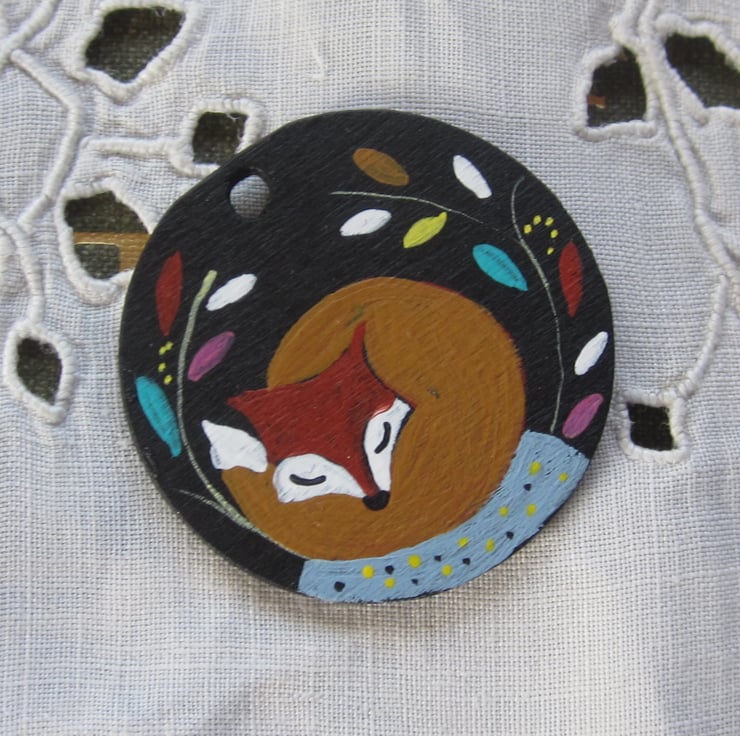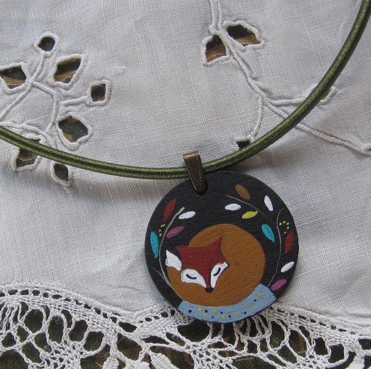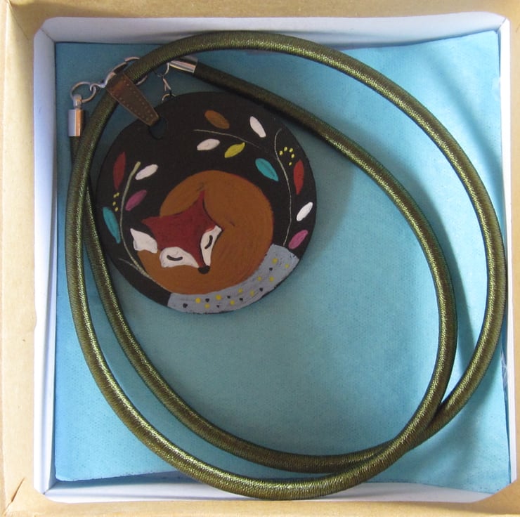 This is a hand illustrated sleeping fox on a wooden disc with a necklace that extends ,signed on the back varnished and comes in a box