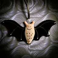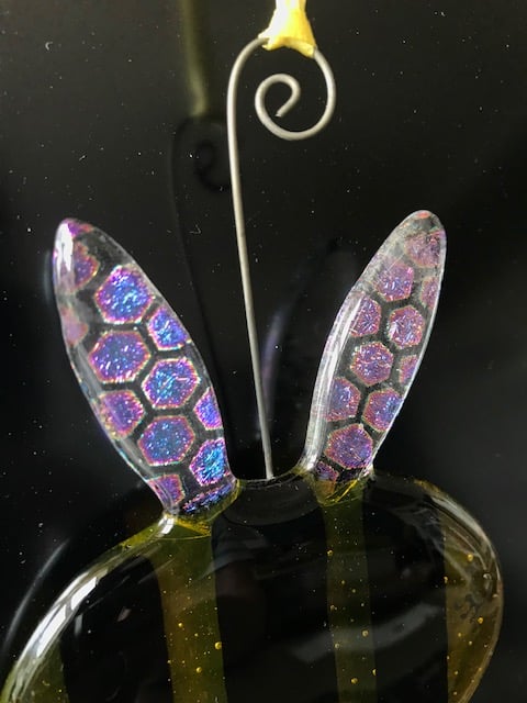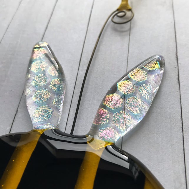 The cute bumble is made from the most glorious transparent yellow glass with black opaque stripes across its body. His wings shimmer and change colour with the effect from the patterned honeycomb dichroic glass...it's a true beauty!