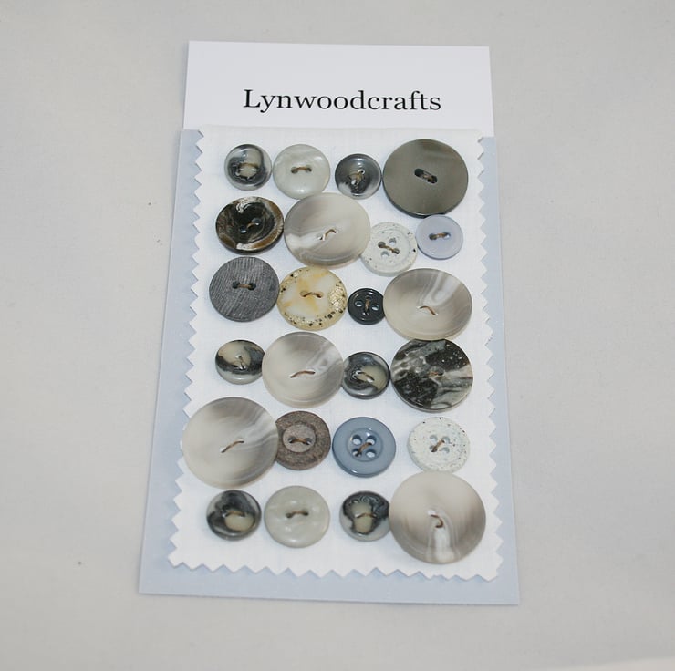 24 grey buttons, including vintage designs, listed in my continuing attempts to 'share my stash'. I have always kept a button tin and it has been augmented by the addition of three more family 'button tins'. In addition, I can't resist continuing to buy new and vintage buttons. I now have more than I can reasonably expect to use - so its time to try to re-home some of them.